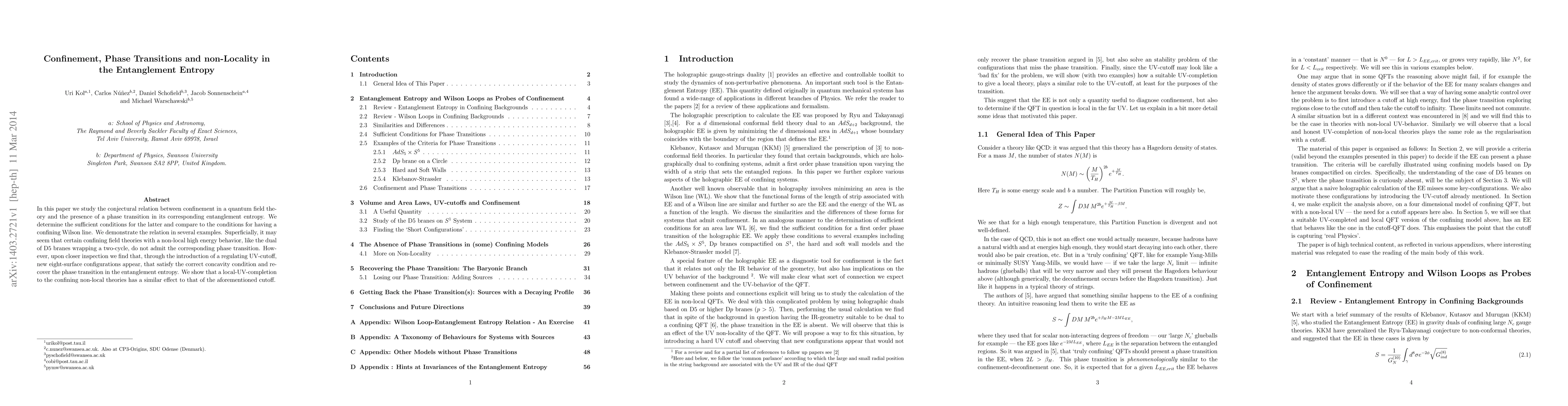 In this paper we study the conjectural relation between confinement in a quantum field theory and the presence of a phase transition in its corresponding entanglement entropy. We determine the sufficient conditions for the latter and compare to the conditions for having a confining Wilson line. We demonstrate the relation in several examples. Superficially, it may seem that certain confining field theories with a non-local high energy behaviour, like the dual of D5 branes wrapping a two-cycle, do not admit the corresponding phase transition. However, upon closer inspection we find that, through the introduction of a regulating UV-cutoff, new eight-surface configurations appear, that satisfy the correct concavity condition and recover the phase transition in the entanglement entropy. We show that a local-UV-completion to the confining non-local theories has a similar effect to that of the aforementioned cutoff.