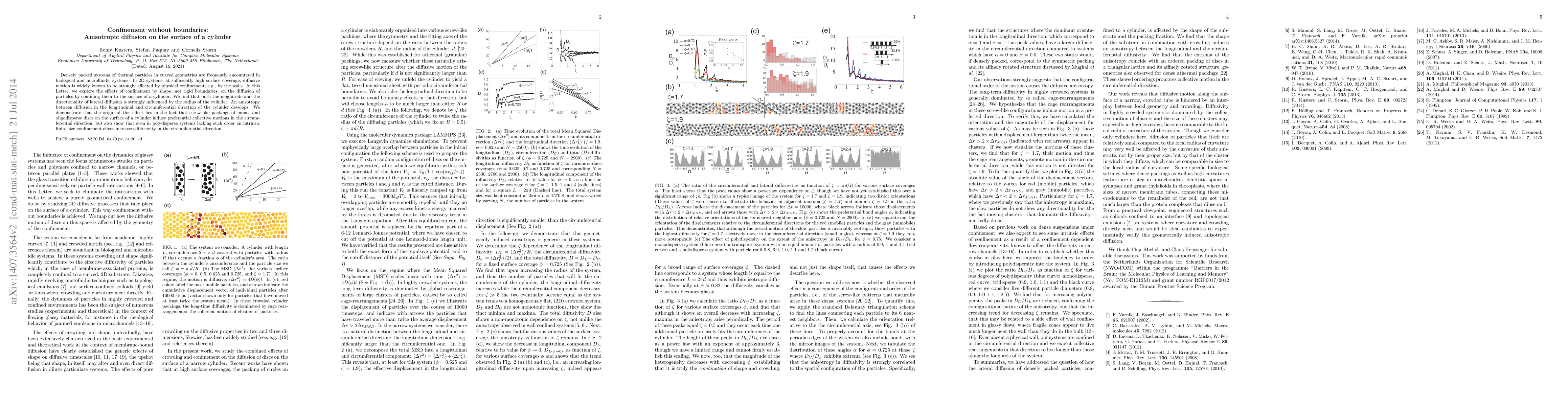 Densely packed systems of thermal particles in curved geometries are frequently encountered in biological and microfluidic systems. In 2D systems, at sufficiently high surface coverage, diffusive motion is widely known to be strongly affected by physical confinement, e.g., by the walls. In this Letter, we explore the effects of confinement by shape, not rigid boundaries, on the diffusion of particles by confining them to the surface of a cylinder. We find that both the magnitude and the directionality of lateral diffusion is strongly influenced by the radius of the cylinder. An anisotropy between diffusion in the longitudinal and circumferential direction of the cylinder develops. We demonstrate that the origin of this effect lies in the fact that screw-like packings of mono- and oligodisperse discs on the surface of a cylinder induce preferential collective motions in the circumferential direction, but also show that even in polydisperse systems lacking such order an intrinsic finite size confinement effect increases diffusivity in the circumferential direction.