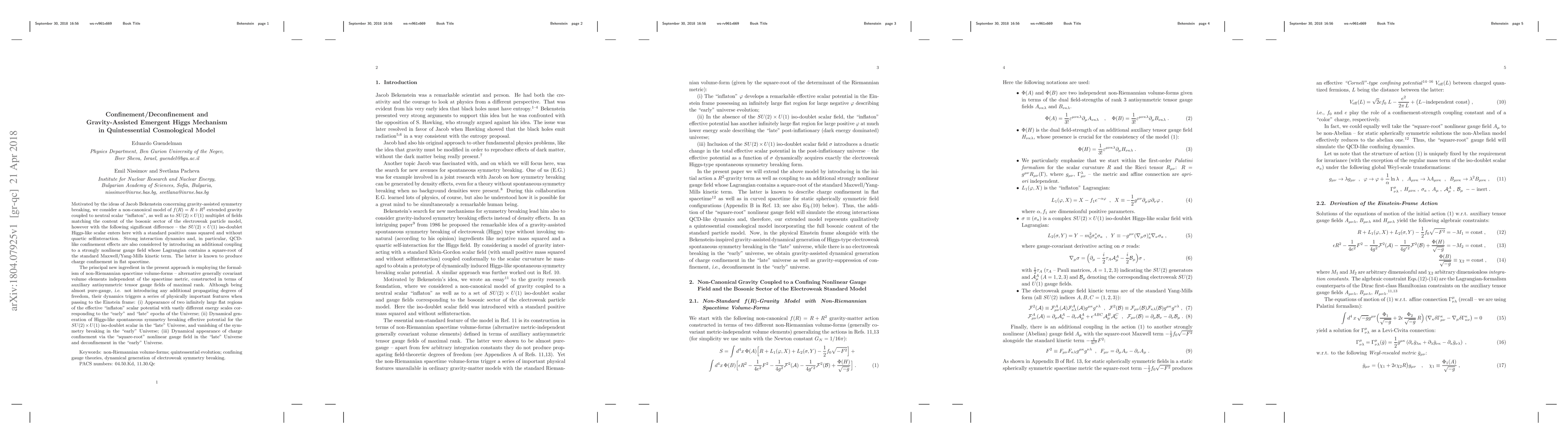 This paper explores a non-canonical extended gravity model with a neutral scalar "inflaton" and an SU(2)xU(1) multiplet, proposing a gravity-assisted emergent Higgs mechanism and confinement/deconfinement dynamics through non-Riemannian spacetime volume-forms and a nonlinear gauge field. The model dynamically generates Higgs-like symmetry breaking and charge confinement in the "late" Universe, with deconfinement in the "early" Universe.