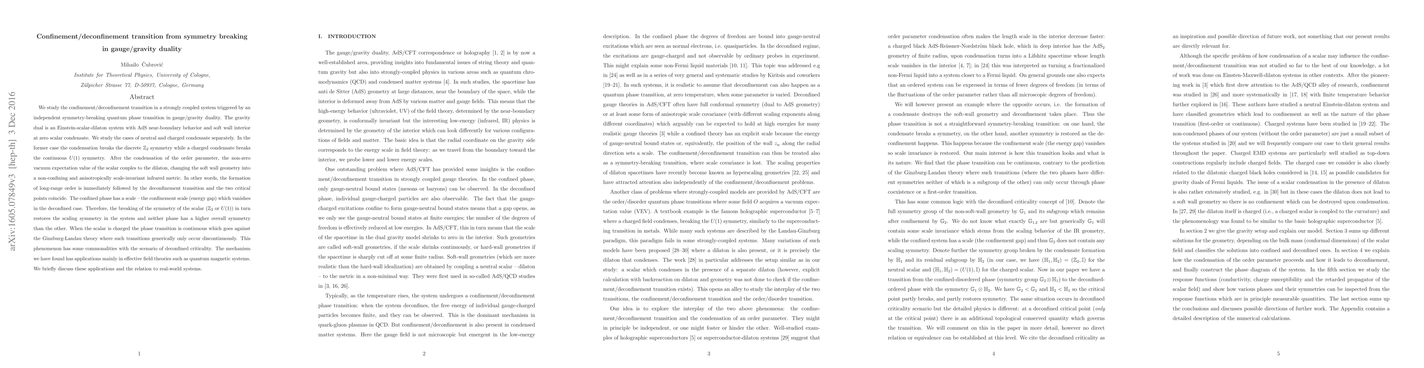 This paper investigates the confinement/deconfinement transition in strongly coupled systems via gauge/gravity duality, showing that symmetry breaking from a quantum phase transition leads to a deconfinement transition. The study finds that the breaking of $\mathbb{Z}_2$ or $U(1)$ symmetries restores scaling symmetry, with charged condensates leading to continuous transitions contrary to typical Ginzburg-Landau theory predictions.