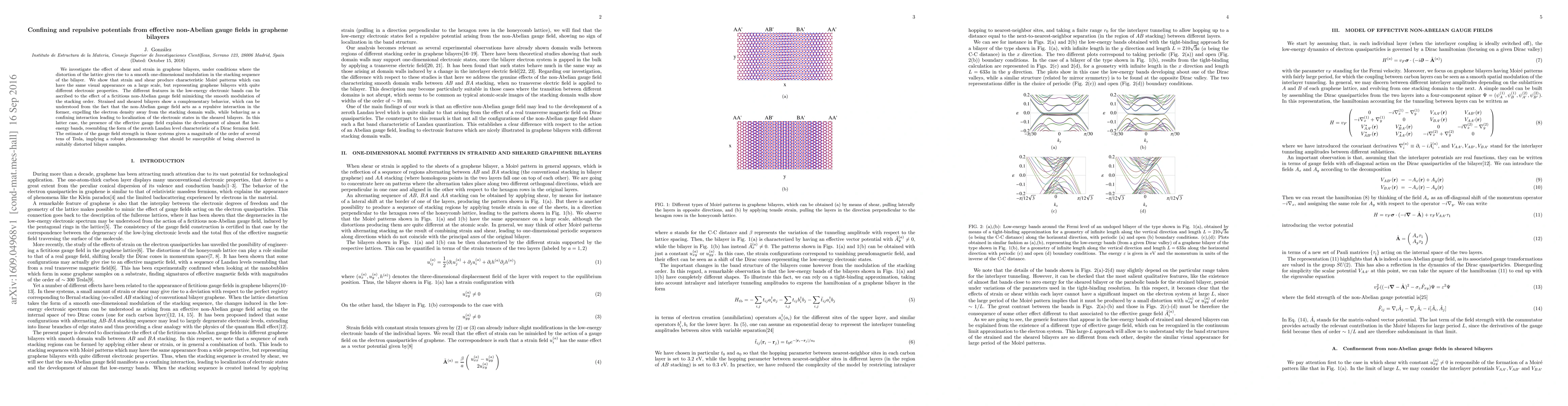 This paper explores the impact of shear and strain on graphene bilayers, revealing that they induce distinct Moir\'e patterns and electronic properties due to a non-Abelian gauge field effect. The gauge field acts as a repulsive force in strained bilayers, while it confines electrons in sheared bilayers, leading to localized electronic states and flat low-energy bands.