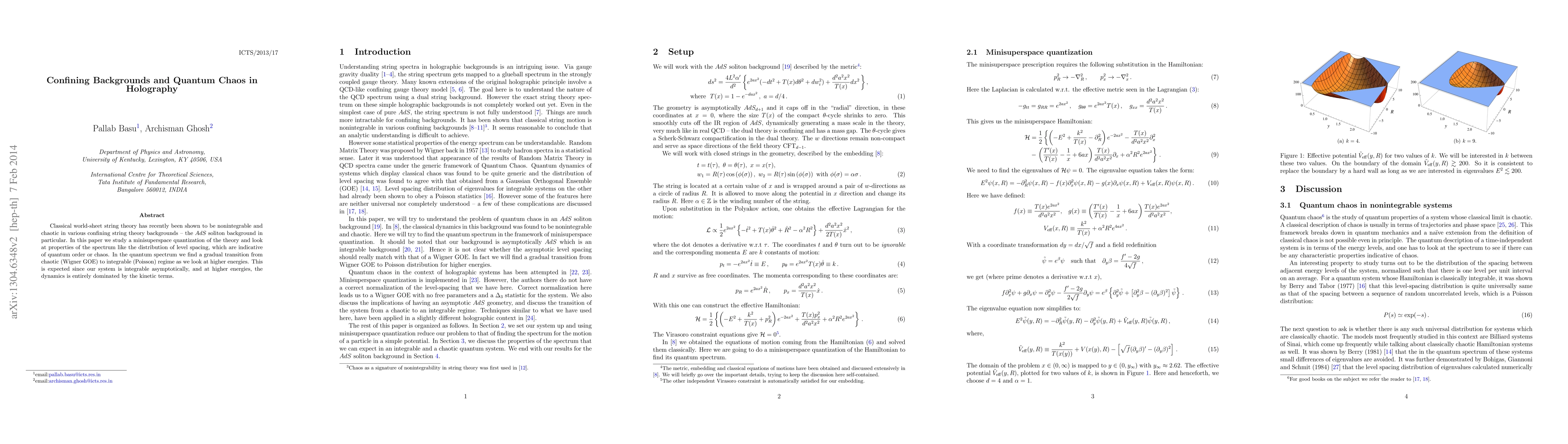 Classical world-sheet string theory has recently been shown to be nonintegrable and chaotic in various confining string theory backgrounds -- the AdS soliton background in particular. In this paper we study a minisuperspace quantization of the theory and look at properties of the spectrum like the distribution of level spacing, which are indicative of quantum order or chaos. In the quantum spectrum we find a gradual transition from chaotic (Wigner GOE) to integrable (Poisson) regime as we look at higher energies. This is expected since our system is integrable asymptotically, and at higher energies, the dynamics is entirely dominated by the kinetic terms.