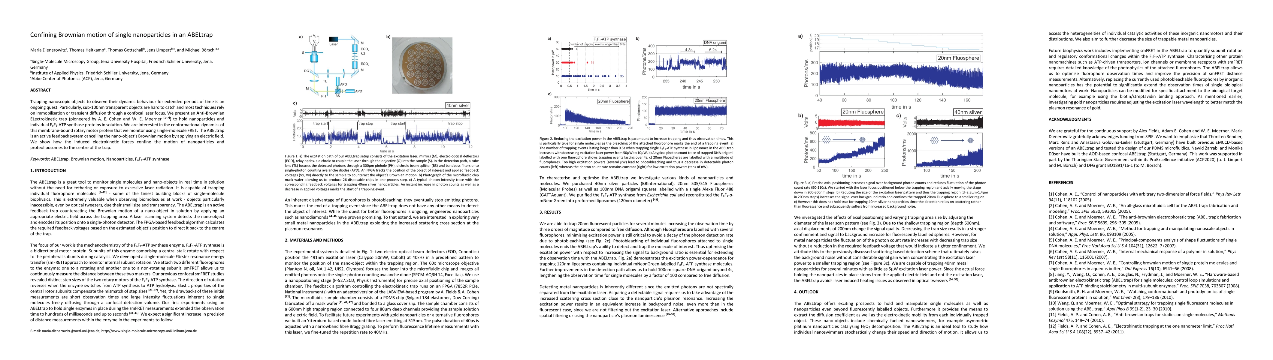 This paper presents an Anti-Brownian ELectrokinetic trap (ABELtrap) to confine and hold nanoparticles and individual FoF1-ATP synthase proteins in solution, enabling the observation of their dynamic behavior over extended periods. The ABELtrap uses an electric field to cancel Brownian motion, allowing for the study of conformational dynamics using single-molecule FRET.