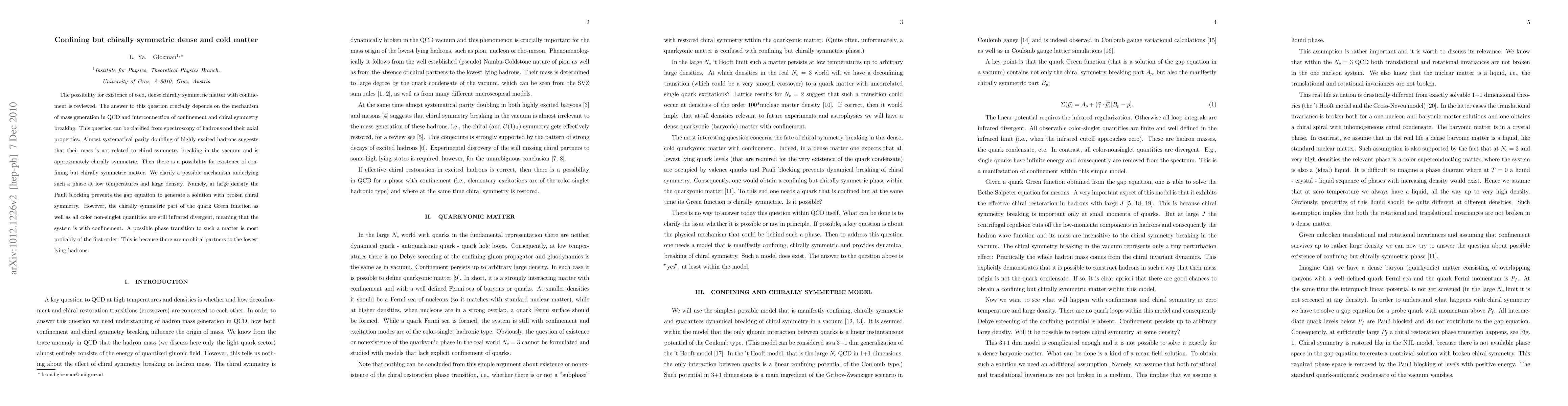 The research reviews the possibility of cold, dense chirally symmetric matter with confinement, examining the interconnection of confinement and chiral symmetry breaking in QCD through hadron spectroscopy and axial properties.