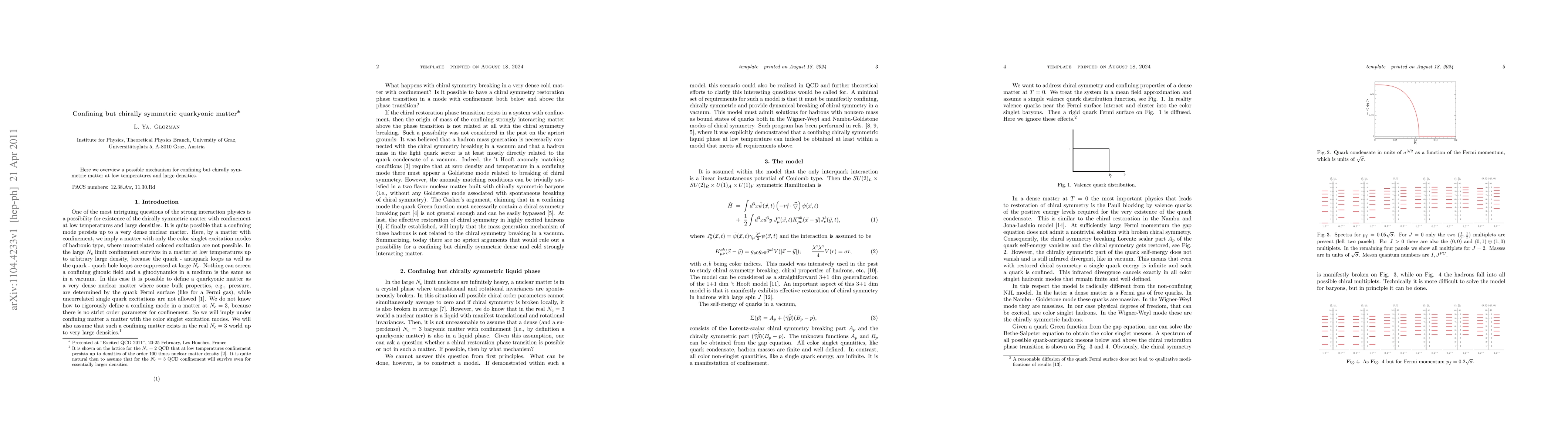 Summary: This paper explores a theoretical framework for quarkyonic matter, proposing that it can exist in a confining yet chirally symmetric state at low temperatures and high densities, challenging conventional understanding of quark-gluon plasma.