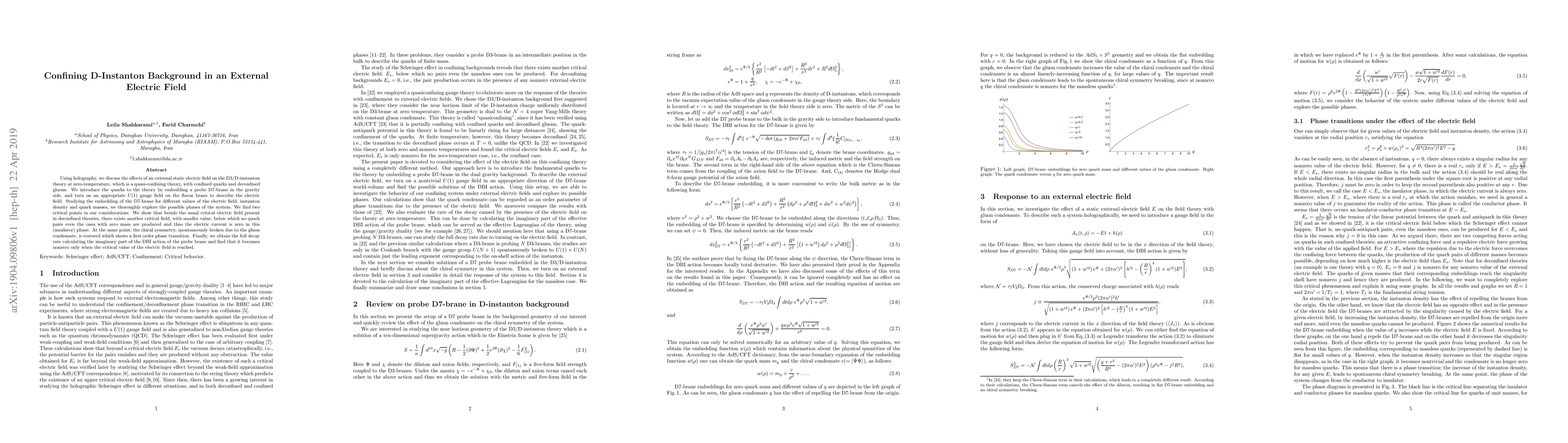Using holography, we discuss the effects of an external static electric field on the D3/D-instanton theory at zero-temperature, which is a quasi-confining theory, with confined quarks and deconfined gluons. We introduce the quarks to the theory by embedding a probe D7-brane in the gravity side, and turn on an appropriate $U(1)$ gauge field on the flavor brane to describe the electric field. Studying the embedding of the D7-brane for different values of the electric field, instanton density and quark masses, we thoroughly explore the possible phases of the system. We find two critical points in our considerations. We show that beside the usual critical electric field present in deconfined theories, there exists another critical field, with smaller value, below which no quark pairs even the ones with zero mass are produced and thus the electric current is zero in this (insulator) phase. At the same point, the chiral symmetry, spontaneously broken due to the gluon condensate, is restored which shows a first order phase transition. Finally, we obtain the full decay rate calculating the imaginary part of the DBI action of the probe brane and find that it becomes nonzero only when the critical value of the electric field is reached.
