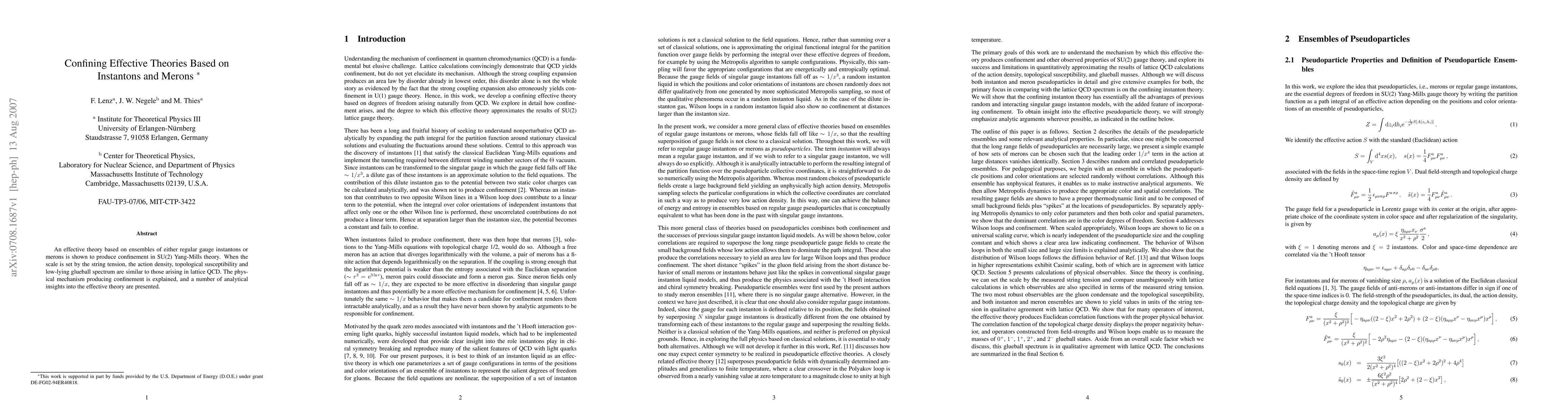 This paper demonstrates that effective theories incorporating either gauge instantons or merons can achieve confinement in SU(2) Yang-Mills theory, with results comparable to lattice QCD in terms of action density, topological susceptibility, and glueball spectrum. The study provides analytical insights into the underlying mechanism of confinement.