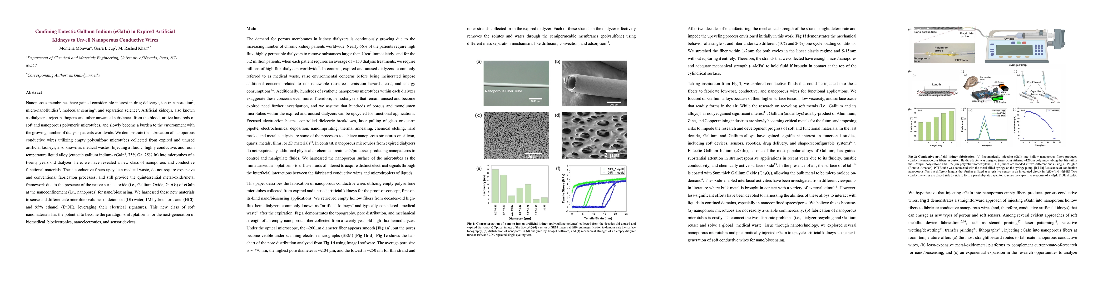 This paper demonstrates the upcycling of expired artificial kidneys into nanoporous conductive wires by injecting a liquid alloy (eutectic gallium indium) into their microtubes, creating a new class of functional materials suitable for sensing applications. These materials offer a sustainable alternative for biomedical and sensor devices.