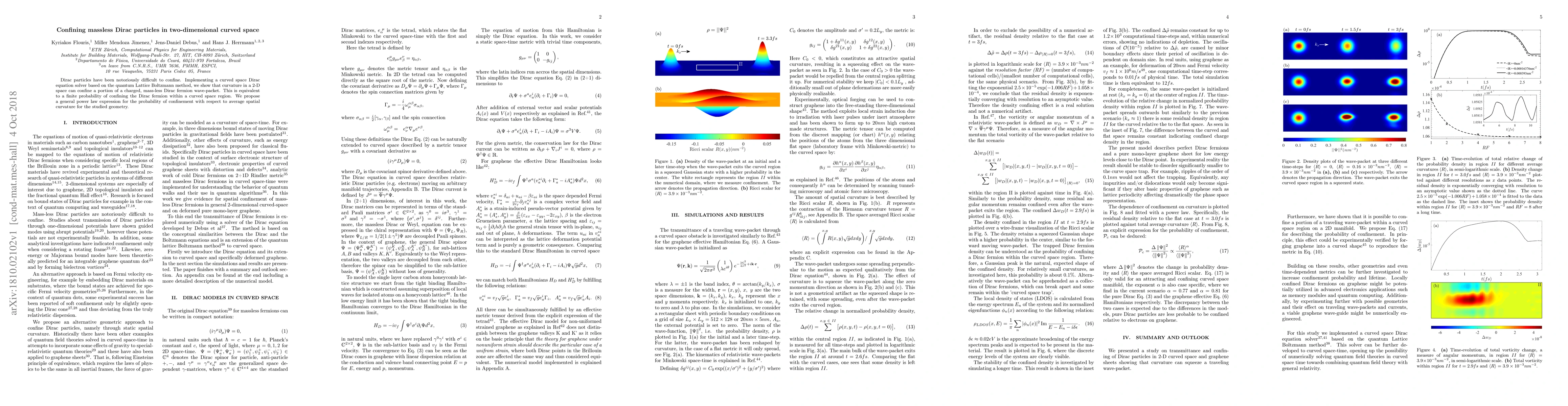 Dirac particles have been notoriously difficult to confine. Implementing a curved space Dirac equation solver based on the quantum Lattice Boltzmann method, we show that curvature in a 2-D space can confine a portion of a charged, mass-less Dirac fermion wave-packet. This is equivalent to a finite probability of confining the Dirac fermion within a curved space region. We propose a general power law expression for the probability of confinement with respect to average spatial curvature for the studied geometry.