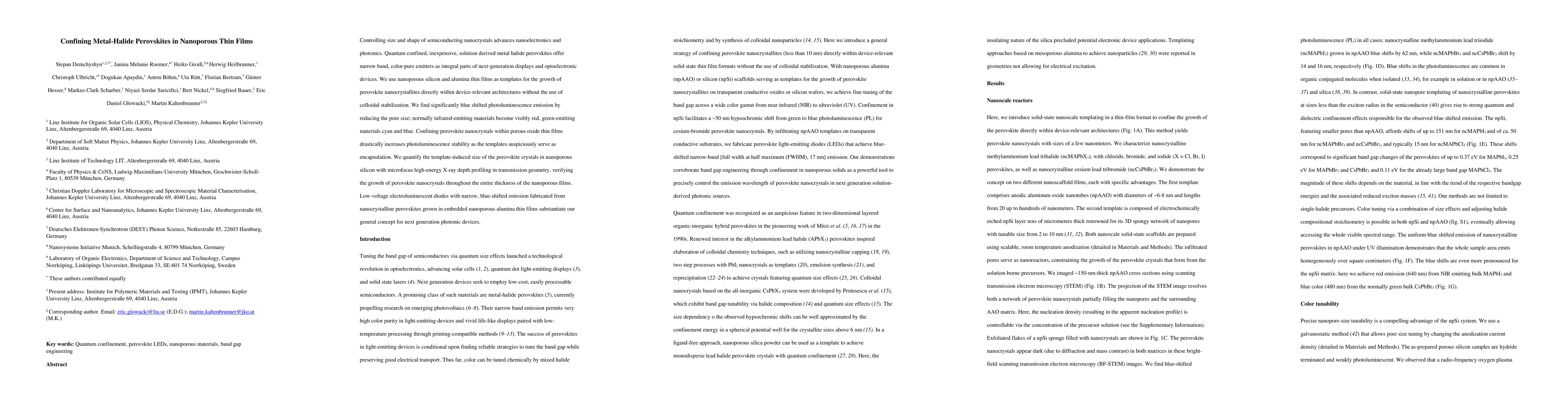 This paper investigates the growth of quantum-confined metal halide perovskite nanocrystals within nanoporous silicon and alumina thin films, achieving significant blue shifts in photoluminescence and enhanced stability. The study demonstrates the potential for these perovskites in next-generation optoelectronic devices, including low-voltage electroluminescent diodes.