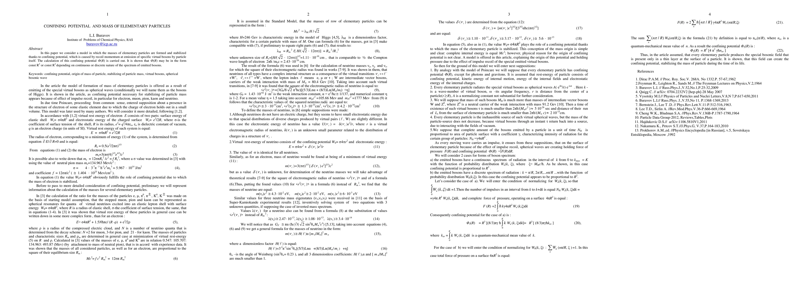 In this paper we consider a model in which the masses of elementary particles are formed and stabilized thanks to confining potential, which is caused by recoil momentum at emission of specific virtual bosons by particle itself. The calculation of this confining potential is carried out. It is shown that $\Phi$(R) may be in the form const $R^3$ or const $R^2$ depending on continuous or discrete nature of the spectrum of emitted bosons.