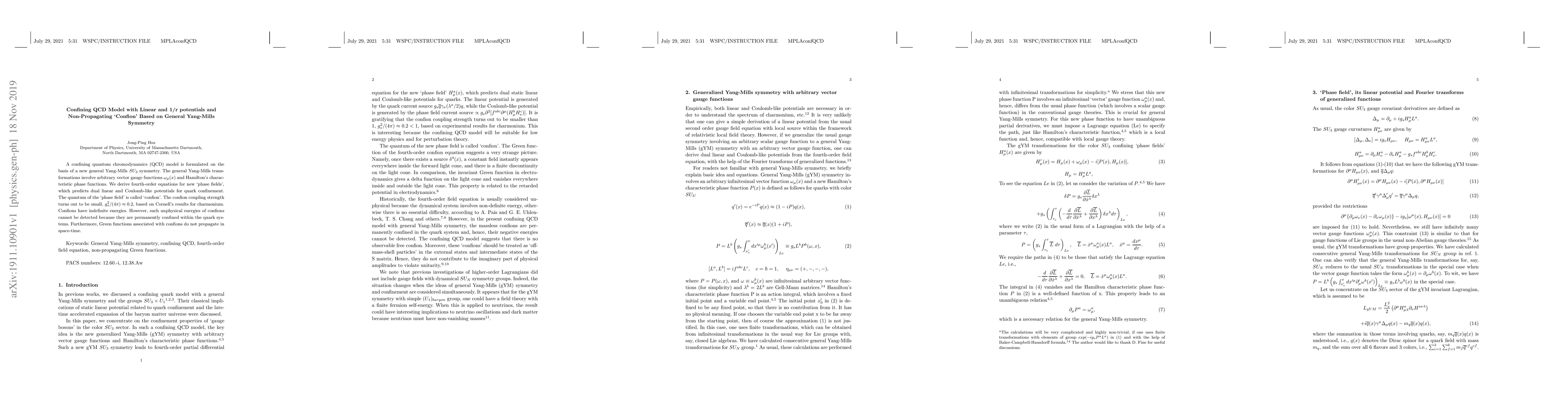 This paper proposes a new QCD model based on general Yang-Mills symmetry, introducing a non-propagating `confion' field that predicts dual linear and Coulomb-like potentials for quark confinement, with a small confion coupling strength derived from charmonium data.