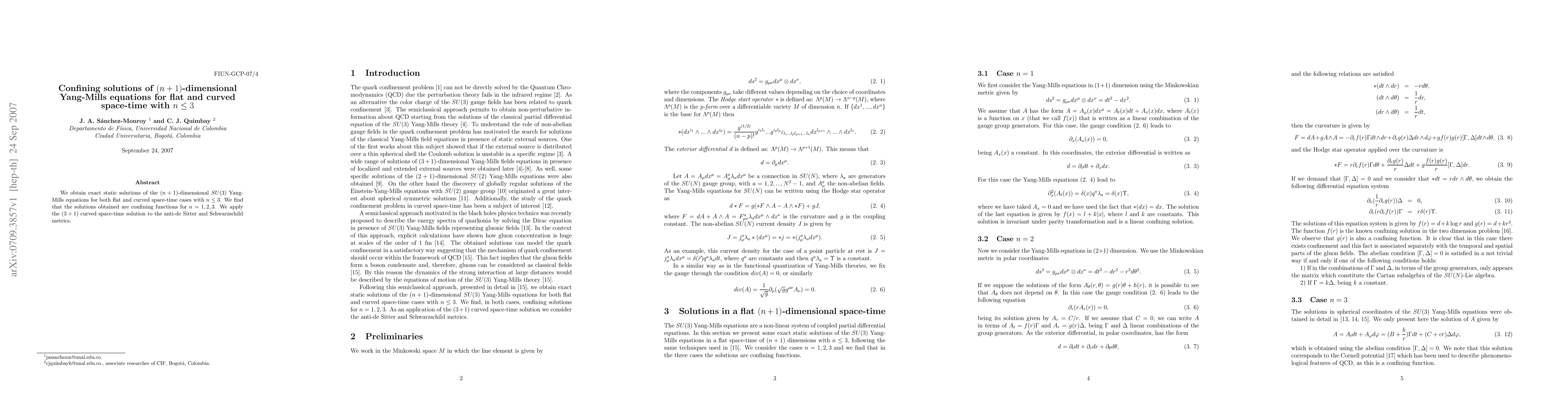 We obtain exact static solutions of the $(n+1)$-dimensional SU(3) Yang-Mills equations for both flat and curved space-time cases with $n \le 3$. We find that the solutions obtained are confining functions for $n = 1, 2, 3$. We apply the $(3+1)$ curved space-time solution to the anti-de Sitter and Schwarzschild metrics.
