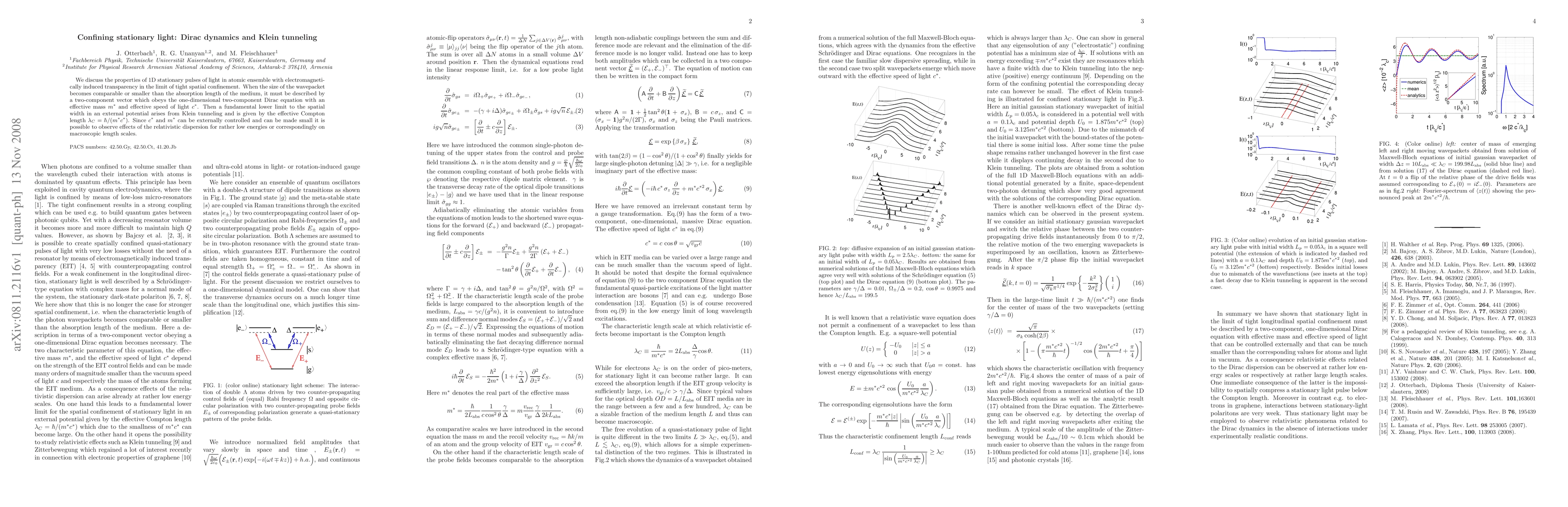 We discuss the properties of 1D stationary pulses of light in atomic ensemble with electromagnetically induced transparency in the limit of tight spatial confinement. When the size of the wavepacket becomes comparable or smaller than the absorption length of the medium, it must be described by a two-component vector which obeys the one-dimensional two-component Dirac equation with an effective mass $m^*$ and effective speed of light $c^*$. Then a fundamental lower limit to the spatial width in an external potential arises from Klein tunneling and is given by the effective Compton length $\lambda_C = \hbar/(m^* c^*)$. Since $c^*$ and $m^*$ can be externally controlled and can be made small it is possible to observe effects of the relativistic dispersion for rather low energies or correspondingly on macroscopic length scales.