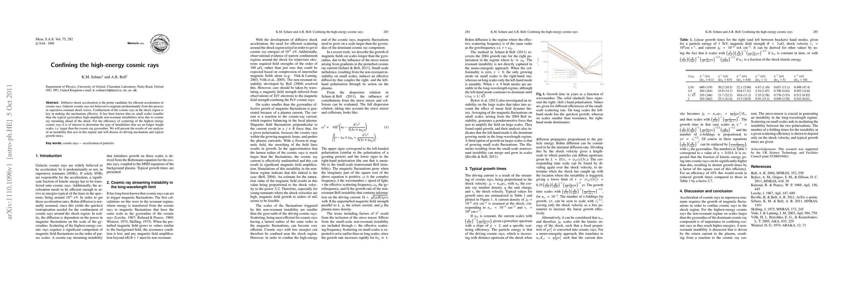 This paper investigates the diffusive shock acceleration mechanism responsible for cosmic ray acceleration in supernova remnants, focusing on the confinement of high-energy cosmic rays. The study analyzes instabilities that affect cosmic rays on scales larger than their gyroradius, determining the type of instability, its driving mechanism, and typical growth times for efficient scattering.