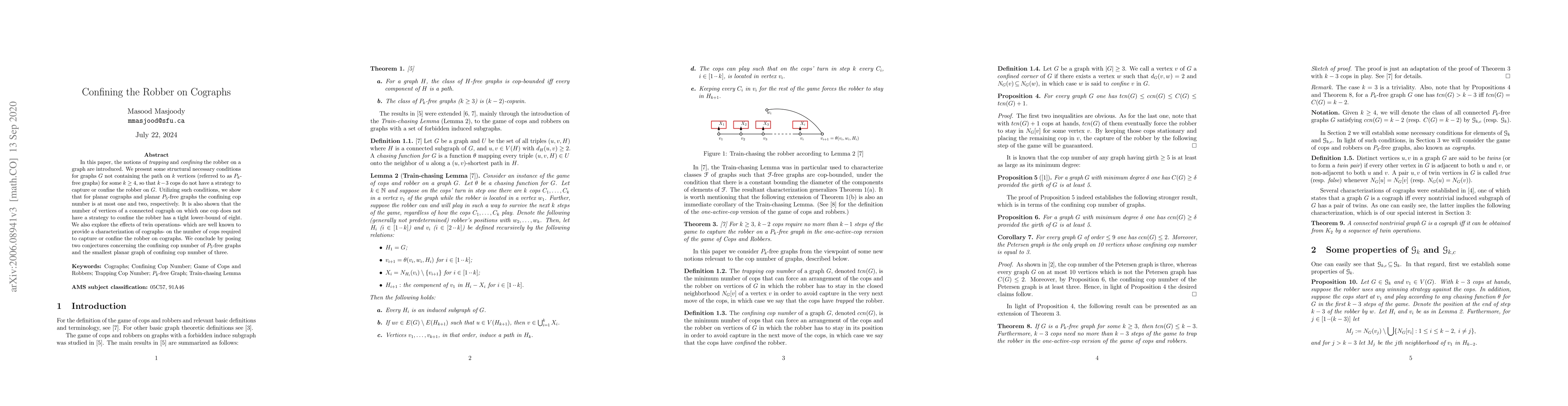 In this paper, the notions of {\em trapping} and {\em confining} the robber on a graph are introduced. We present some structural necessary conditions for graphs $G$ not containing the path on $k$ vertices (referred to as $P_k$-free graphs) for some $k\ge 4$, so that $k-3$ cops do not have a strategy to capture or confine the robber on $G$. Utilizing such conditions, we show that for planar cographs and planar $P_5$-free graphs the confining cop number is at most one and two, respectively. It is also shown that the number of vertices of a connected cograph on which one cop does not have a strategy to confine the robber has a tight lower-bound of eight. We also explore the effects of twin operations -- which are well known to provide a characterization of cographs -- on the number of cops required to capture or confine the robber on cographs. We conclude by posing two conjectures concerning the confining cop number of $P_5$-free graphs and the smallest planar graph of confining cop number of three.