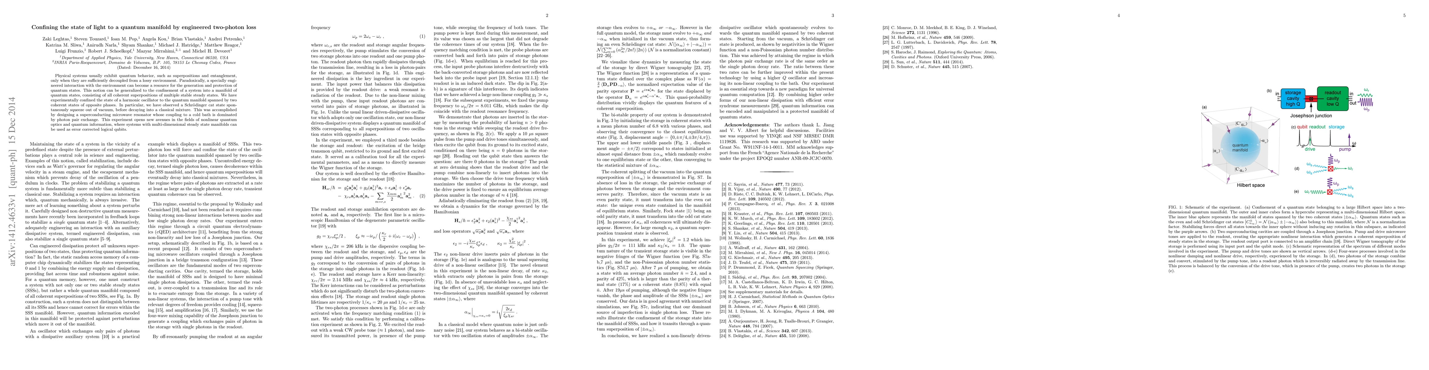 Physical systems usually exhibit quantum behavior, such as superpositions and entanglement, only when they are sufficiently decoupled from a lossy environment. Paradoxically, a specially engineered interaction with the environment can become a resource for the generation and protection of quantum states. This notion can be generalized to the confinement of a system into a manifold of quantum states, consisting of all coherent superpositions of multiple stable steady states. We have experimentally confined the state of a harmonic oscillator to the quantum manifold spanned by two coherent states of opposite phases. In particular, we have observed a Schrodinger cat state spontaneously squeeze out of vacuum, before decaying into a classical mixture. This was accomplished by designing a superconducting microwave resonator whose coupling to a cold bath is dominated by photon pair exchange. This experiment opens new avenues in the fields of nonlinear quantum optics and quantum information, where systems with multi-dimensional steady state manifolds can be used as error corrected logical qubits.
