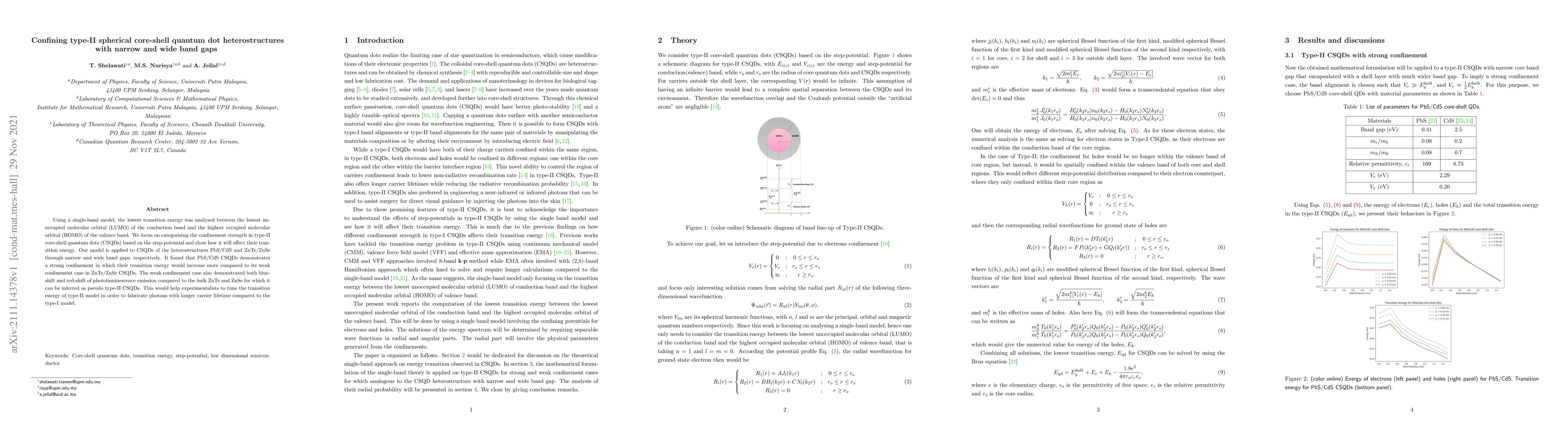 Using a single-band model, the lowest transition energy was analysed between the lowest unoccupied molecular orbital (LUMO) of the conduction band and the highest occupied molecular orbital (HOMO) of the valence band. We focus on categorising the confinement strength in type-II core-shell quantum dots (CSQDs) based on the step-potential and show how it will affect their transition energy. Our model is applied to CSQDs of the heterostructures PbS/CdS and ZnTe/ZnSe through narrow and wide band gaps, respectively. It found that PbS/CdS CSQDs demonstrates a strong confinement in which their transition energy would increase more compared to its weak confinement case in ZnTe/ZnSe CSQDs. The weak confinement case also demonstrated both blue-shift and red-shift of photoluminescence emission compared to the bulk ZnTe and ZnSe for which it can be inferred as pseudo type-II CSQDs. This would help experimentalists to tune the transition energy of type-II model in order to fabricate photons with longer carrier lifetime compared to the type-I model.