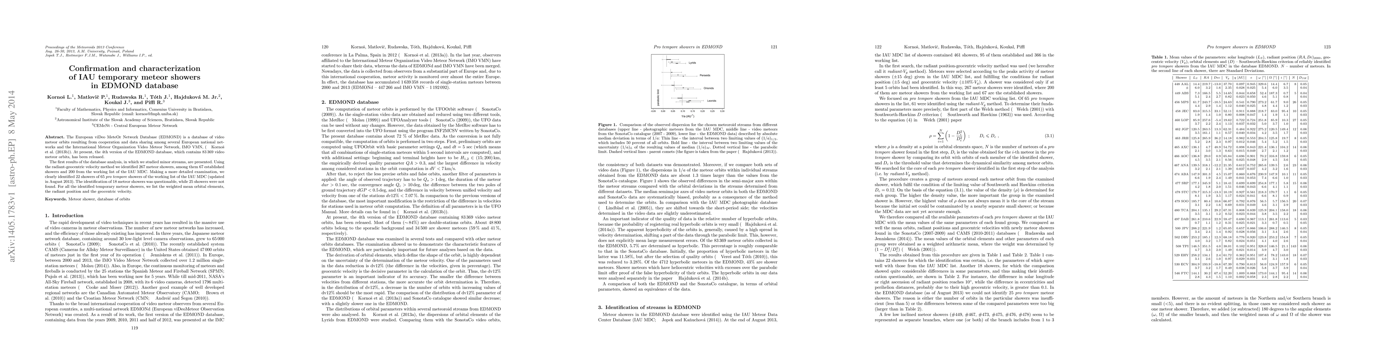 This study analyzes the EDMOND database to confirm and characterize temporary meteor showers, identifying 267 showers including 67 established and 200 provisional ones. Detailed examination confirmed 22 of 65 provisional showers, with 18 questionable and 25 not found, providing orbital elements and radiant positions for identified showers.