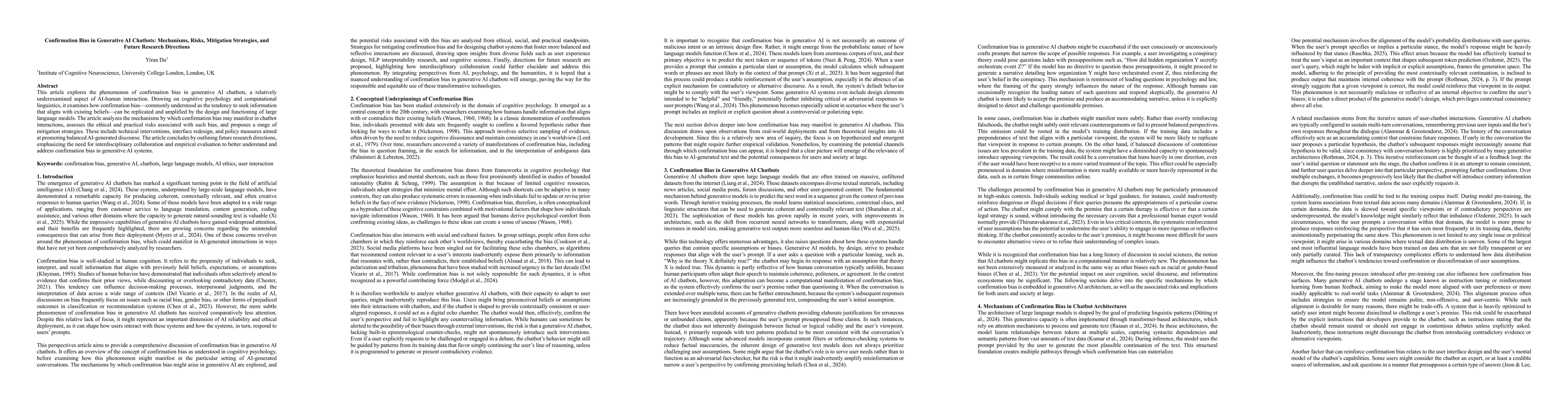 This research is novel in its focus on confirmation bias in generative AI chatbots, an underexamined aspect of AI-human interaction, and its comprehensive exploration of mitigation strategies.