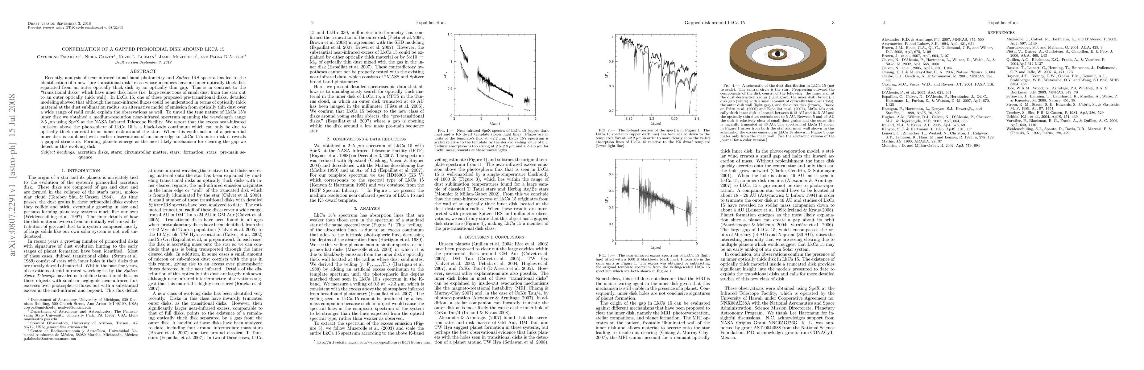 The research confirms the existence of a gapped primordial disk around LkCa 15, characterized by an inner optically thick disk separated from an outer optically thick disk by an optically thin gap. The near-infrared spectrum indicates the inner disk is optically thick, supporting the formation of planets as the likely mechanism for the gap.