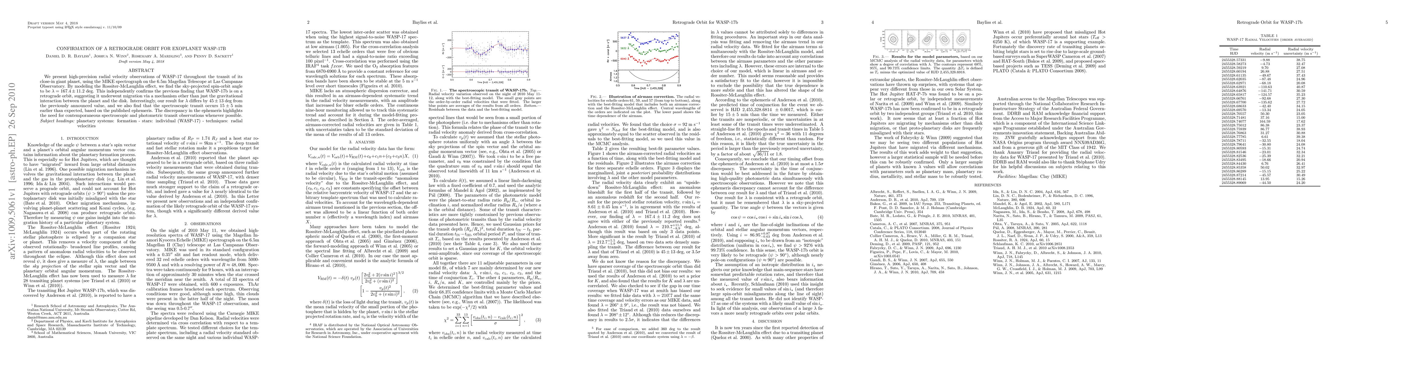 This study confirms the retrograde orbit of the exoplanet WASP-17b using high-precision radial velocity observations, revealing a sky-projected spin-orbit angle of 167.4° ± 11.2°, which supports its retrograde nature and suggests alternative migration mechanisms. The findings also highlight discrepancies in the ephemeris, underscoring the importance of combined spectroscopic and photometric observations.