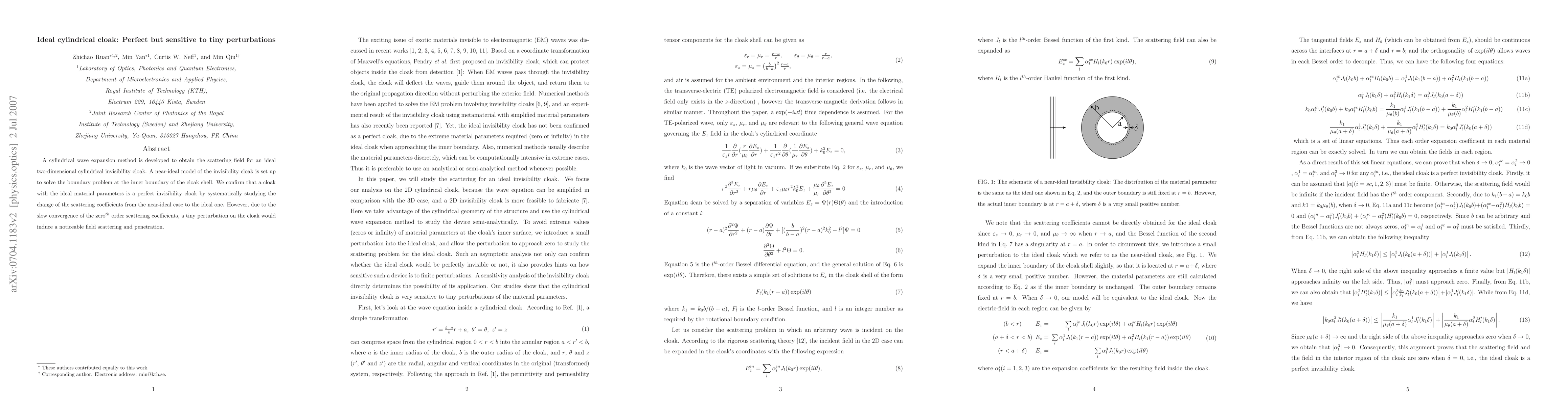 This paper confirms the effectiveness of a cylindrical perfect invisibility cloak using Fourier-Bessel analysis, demonstrating that ideal material parameters enable complete invisibility. However, the study highlights that even slight perturbations can cause significant scattering due to slow convergence of zeroth-order scattering coefficients.