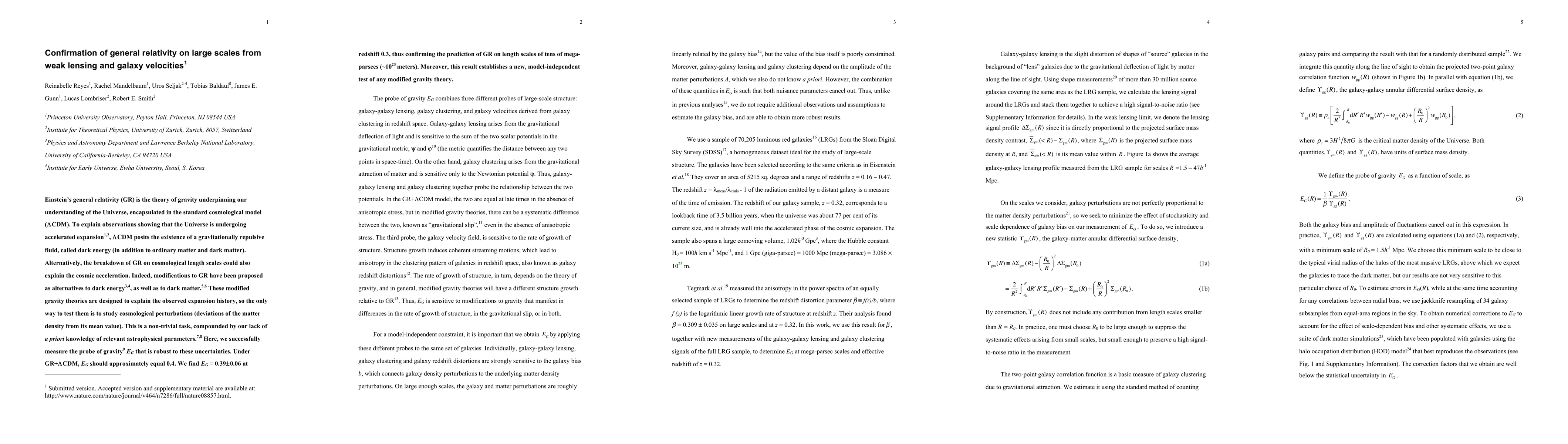 This study confirms general relativity on large scales using weak lensing and galaxy velocities, finding a value of EG consistent with predictions and excluding modified gravity theories.