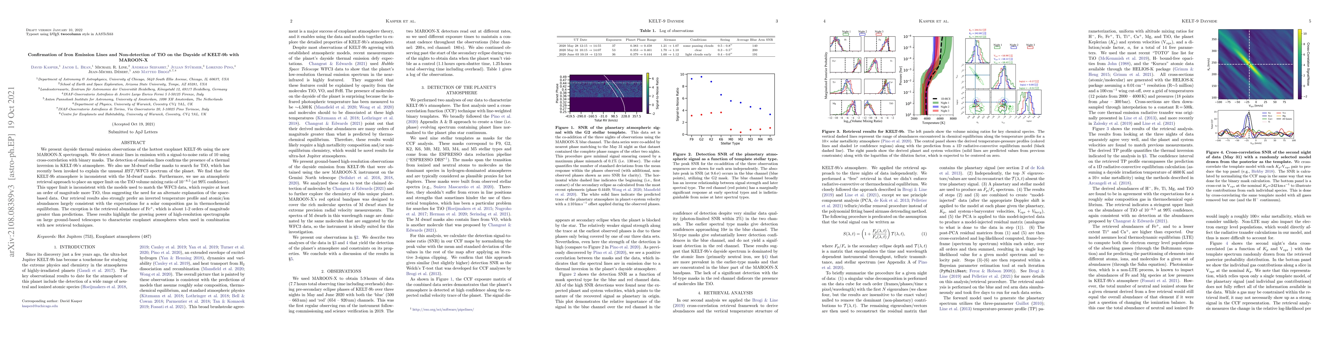 The MAROON-X spectrograph confirms the presence of iron emission lines in the atmosphere of the hottest exoplanet KELT-9b, indicating a thermal inversion. The study does not detect TiO, placing an upper limit inconsistent with models explaining previous HST/WFC3 data, thus suggesting alternative explanations are needed.