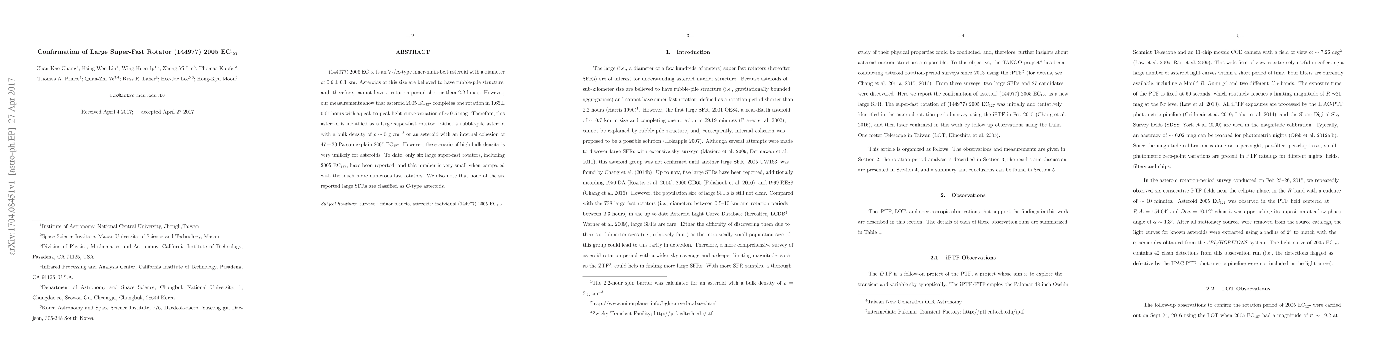(144977) 2005 EC127 is an V-/A-type inner-main-belt asteroid with a diameter of 0.6 +- 0.1 km. Asteroids of this size are believed to have rubble-pile structure, and, therefore, cannot have a rotation period shorter than 2.2 hours. However, our measurements show that asteroid 2005 EC127 completes one rotation in 1.65 +- 0.01 hours with a peak-to-peak light-curve variation of ~0.5 mag. Therefore, this asteroid is identified as a large super-fast rotator. Either a rubble-pile asteroid with a bulk density of ~6 g cm^-3 or an asteroid with an internal cohesion of 47 +- 30 Pa can explain 2005 EC127. However, the scenario of high bulk density is very unlikely for asteroids. To date, only six large super-fast rotators, including 2005 EC127, have been reported, and this number is very small when compared with the much more numerous fast rotators. We also note that none of the six reported large SFRs are classified as C-type asteroids.
