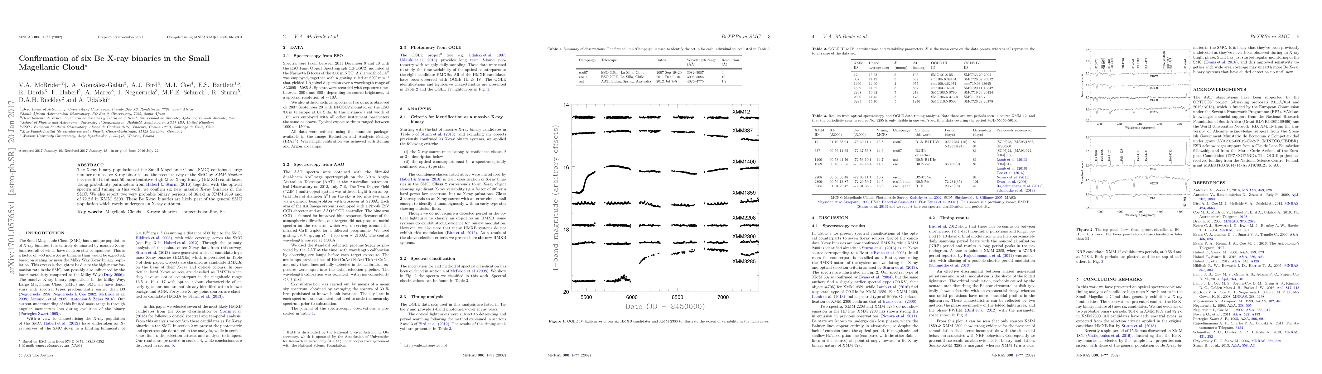 The X-ray binary population of the Small Magellanic Cloud (SMC) contains a large number of massive X-ray binaries and the recent survey of the SMC by XMM-Newton has resulted in almost 50 more tentative high mass X-ray binary candidates. Using probability parameters from Haberl & Sturm (2016) together with the optical spectra and timing in this work, we confirm six new massive X-ray binaries in the SMC. We also report two very probable binary periods; of 36.4d in XMM 1859 and of 72.2 d in XMM 2300. These Be X-ray binaries are likely part of the general SMC population which rarely undergoes an X-ray outburst.