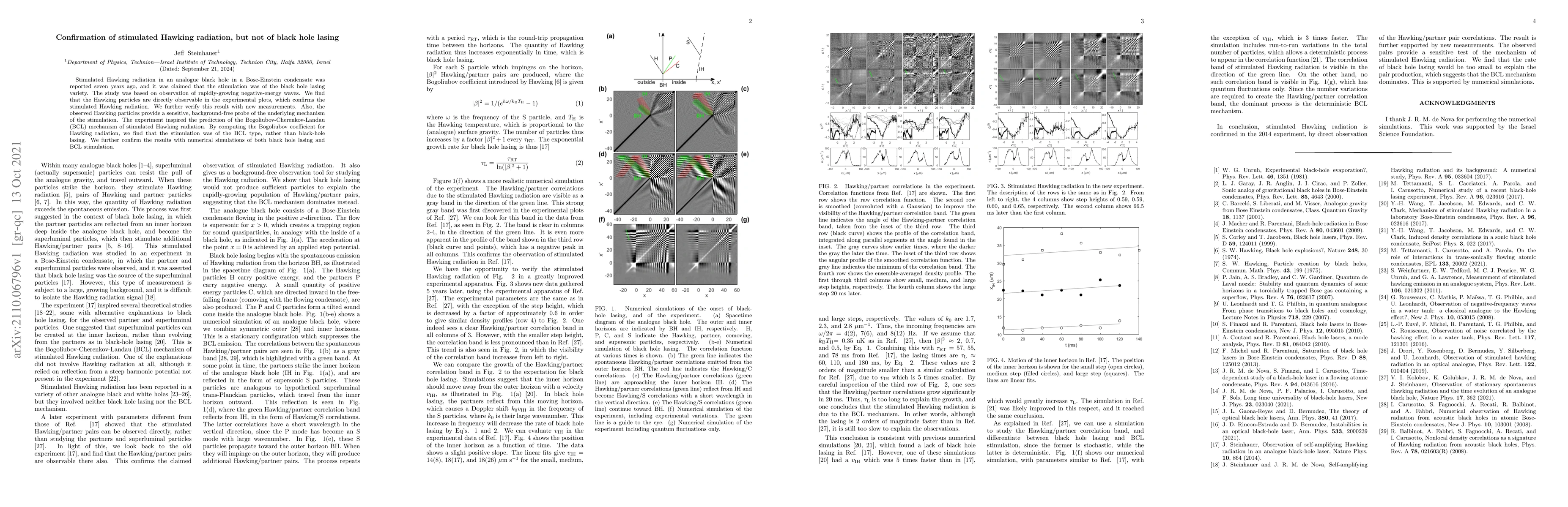 Stimulated Hawking radiation in an analogue black hole in a Bose-Einstein condensate was reported seven years ago, and it was claimed that the stimulation was of the black hole lasing variety. The study was based on observation of rapidly-growing negative-energy waves. We find that the Hawking particles are directly observable in the experimental plots, which confirms the stimulated Hawking radiation. We further verify this result with new measurements. Also, the observed Hawking particles provide a sensitive, background-free probe of the underlying mechanism of the stimulation. The experiment inspired the prediction of the Bogoliubov-Cherenkov-Landau (BCL) mechanism of stimulated Hawking radiation. By computing the Bogoliubov coefficient for Hawking radiation, we find that the stimulation was of the BCL type, rather than black-hole lasing. We further confirm the results with numerical simulations of both black hole lasing and BCL stimulation.