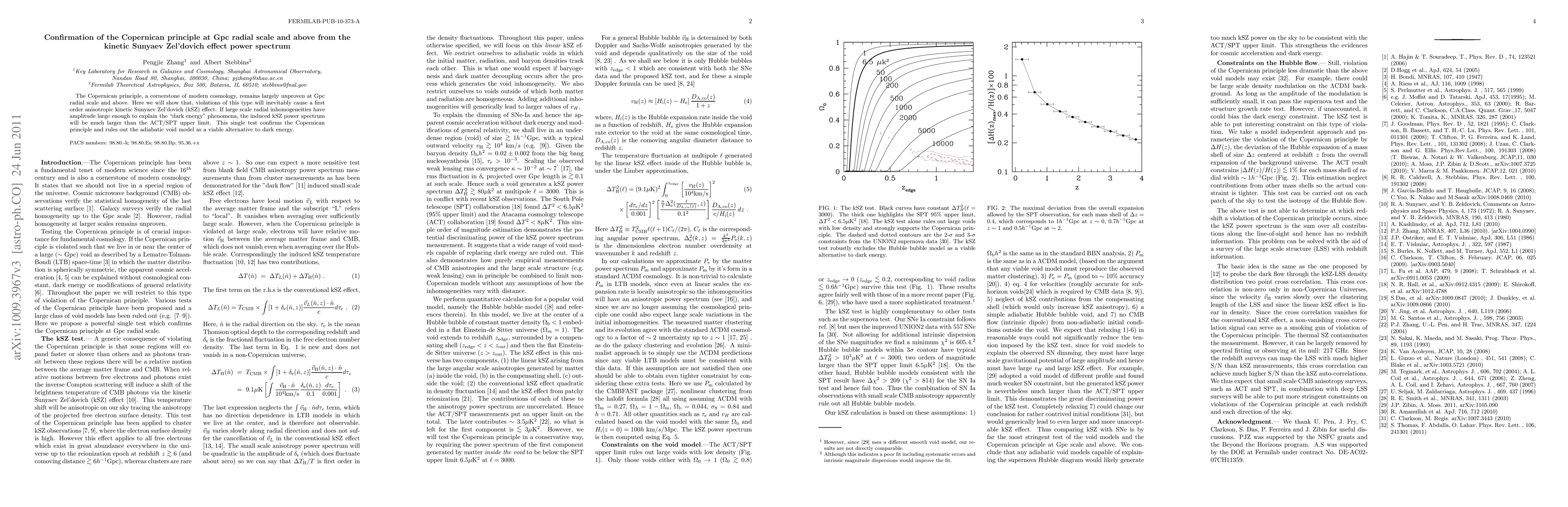 This paper confirms the Copernican principle at the Gpc radial scale and above using the kinetic Sunyaev Zel'dovich effect power spectrum, demonstrating that large-scale radial inhomogeneities cannot explain "dark energy" without exceeding observational limits, thus ruling out the adiabatic void model.