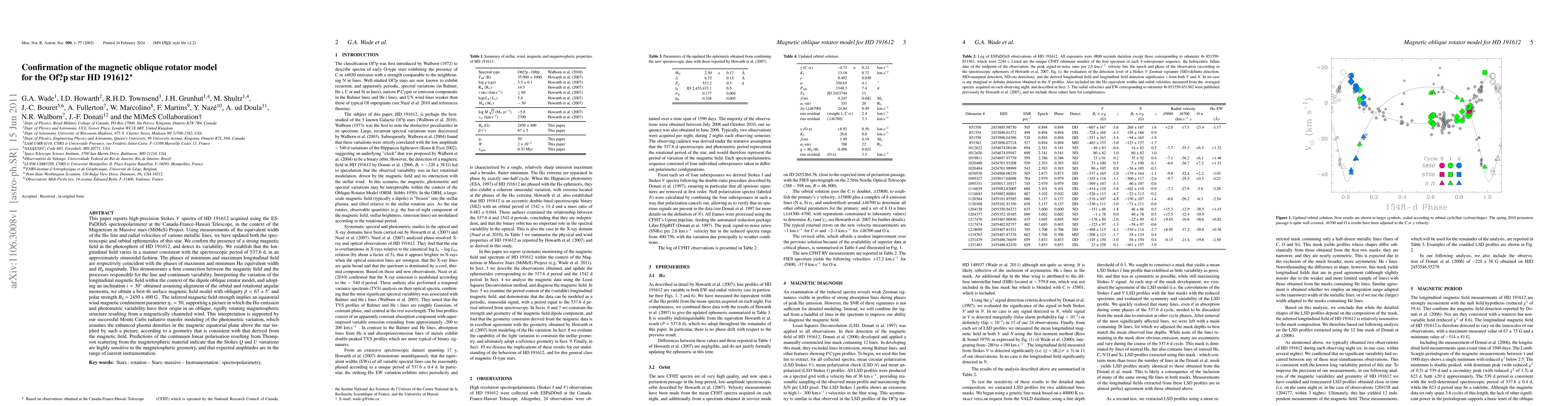 This paper reports high-precision Stokes V spectra of HD 191612 acquired using the ESPaDOnS spectropolarimeter at the Canada-France-Hawaii Telescope, in the context of the Magnetism in Massive stars (MiMeS) Project. Using measurements of the equivalent width of the Halpha line and radial velocities of various metallic lines, we have updated both the spectroscopic and orbital ephemerides of this star. We confirm the presence of a strong magnetic field in the photosphere of HD 191612, and detect its variability. We establish that the longitudinal field varies in a manner consistent with the spectroscopic period of 537.6 d, in an approximately sinusoidal fashion. This demonstrates a firm connection between the magnetic field and the processes responsible for the line and continuum variability. Interpreting the variation of the longitudinal magnetic field within the context of the dipole oblique rotator model we obtain a best-fit surface magnetic field model with obliquity beta=67\pm 5 deg and polar strength Bd=2450\pm 400 G . The inferred magnetic field strength implies an equatorial wind magnetic confinement parameter eta*~50, supporting a picture in which the Halpha emission and photometric variability have their origin in an oblique, rigidly rotating magnetospheric structure resulting from a magnetically channeled wind. This interpretation is supported by our successful Monte Carlo radiative transfer modeling of the photometric variation, which assumes the enhanced plasma densities in the magnetic equatorial plane above the star implied by such a picture. Predictions of the continuum linear polarisation resulting from Thompson scattering from the magnetospheric material indicate that the Stokes Q and U variations are highly sensitive to the magnetospheric geometry, and that expected amplitudes are in the range of current instrumentation. (abridged)
