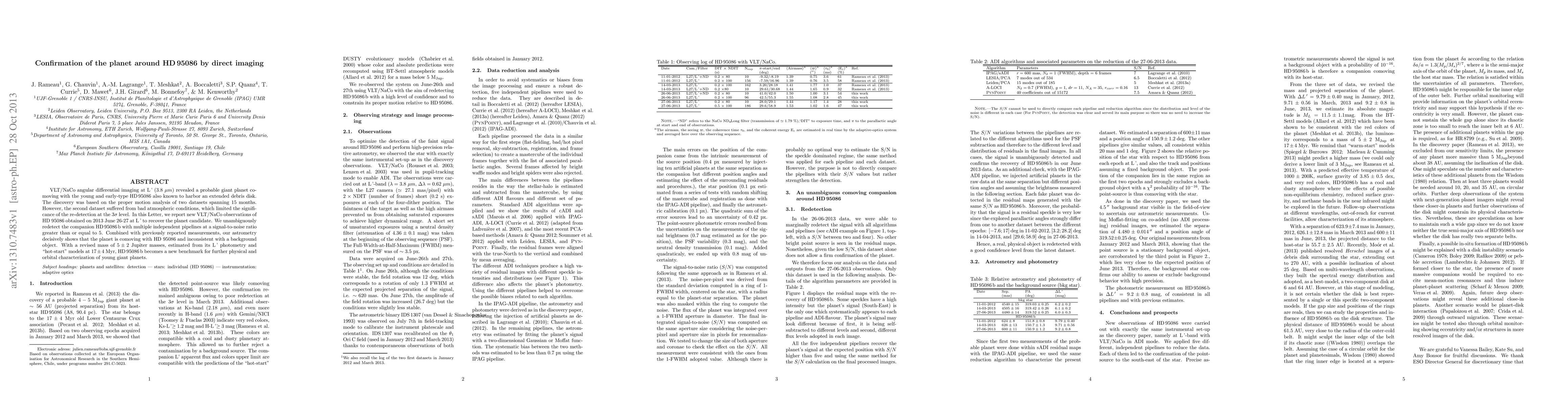 The VLT/NaCo observations confirm the presence of a giant planet, HD 95086 b, orbiting the young star HD 95086, using improved astrometry and higher signal-to-noise data. The planet, with a revised mass of 5±2 Jupiter masses, is now established as a benchmark for studying young giant planets.