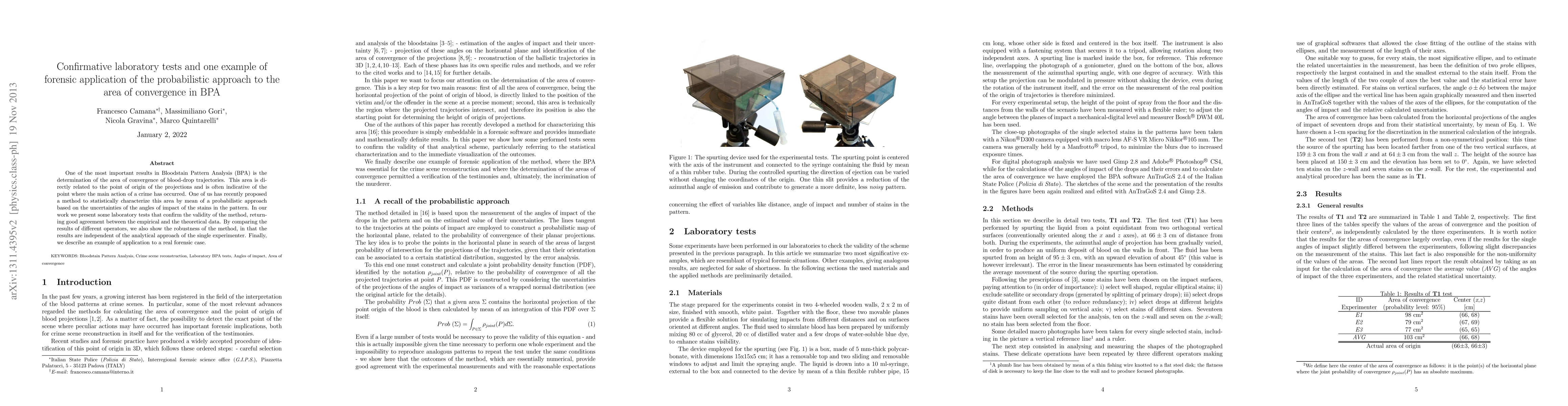 This paper presents laboratory tests confirming the validity of a probabilistic method for determining the area of convergence in Bloodstain Pattern Analysis (BPA), showing good agreement between empirical and theoretical data. It also demonstrates the method's robustness across different operators and applies it to a real forensic case.