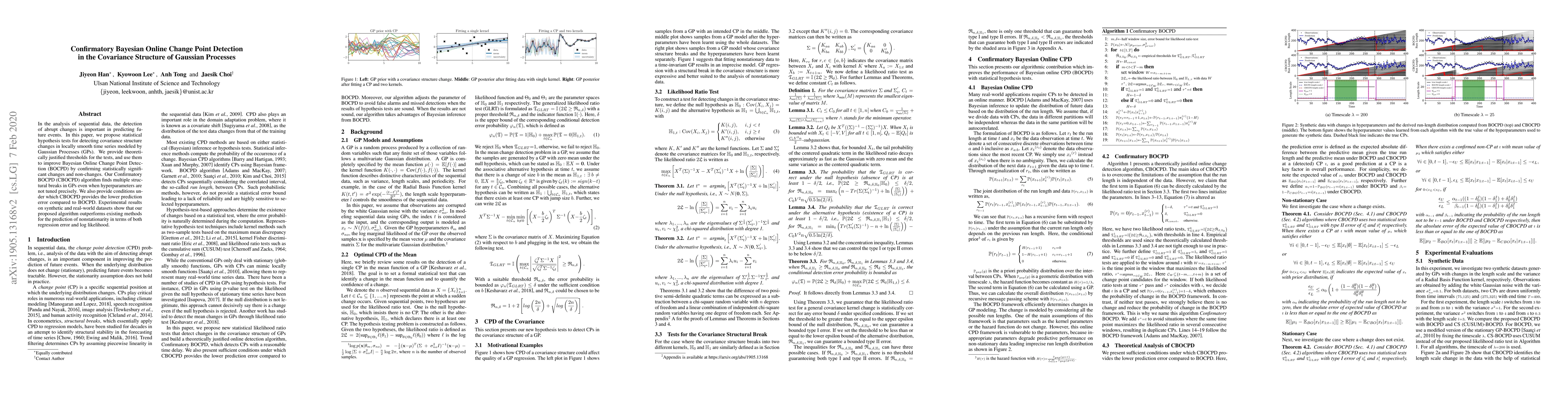 This paper proposes a Confirmatory Bayesian Online Change Point Detection (CBOCPD) algorithm for detecting changes in the covariance structure of Gaussian Processes (GPs). The CBOCPD method uses statistically justified thresholds to confirm significant changes, outperforming existing methods in detecting structural breaks and improving prediction accuracy.