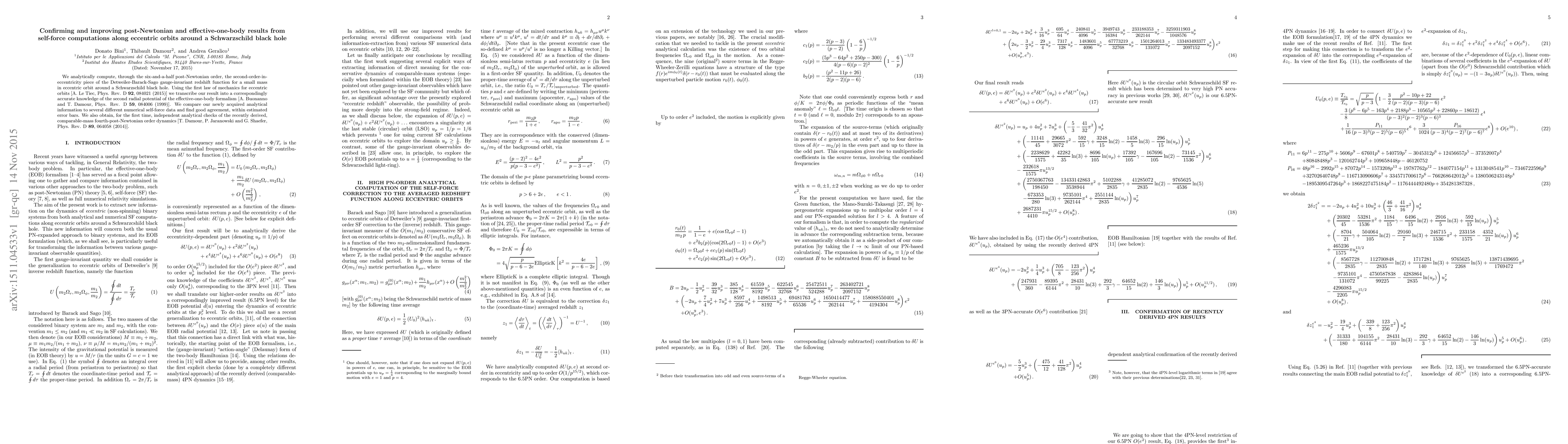 We analytically compute, through the six-and-a-half post-Newtonian order, the second-order-in-eccentricity piece of the Detweiler-Barack-Sago gauge-invariant redshift function for a small mass in eccentric orbit around a Schwarzschild black hole. Using the first law of mechanics for eccentric orbits [A. Le Tiec, Phys. Rev. D {\bf 92}, 084021 (2015)] we transcribe our result into a correspondingly accurate knowledge of the second radial potential of the effective-one-body formalism [A. Buonanno and T. Damour, Phys. Rev. D {\bf 59}, 084006 (1999)]. We compare our newly acquired analytical information to several different numerical self-force data and find good agreement, within estimated error bars. We also obtain, for the first time, independent analytical checks of the recently derived, comparable-mass fourth-post-Newtonian order dynamics [T. Damour, P. Jaranowski and G. Shaefer, Phys. Rev. D {\bf 89}, 064058 (2014)].