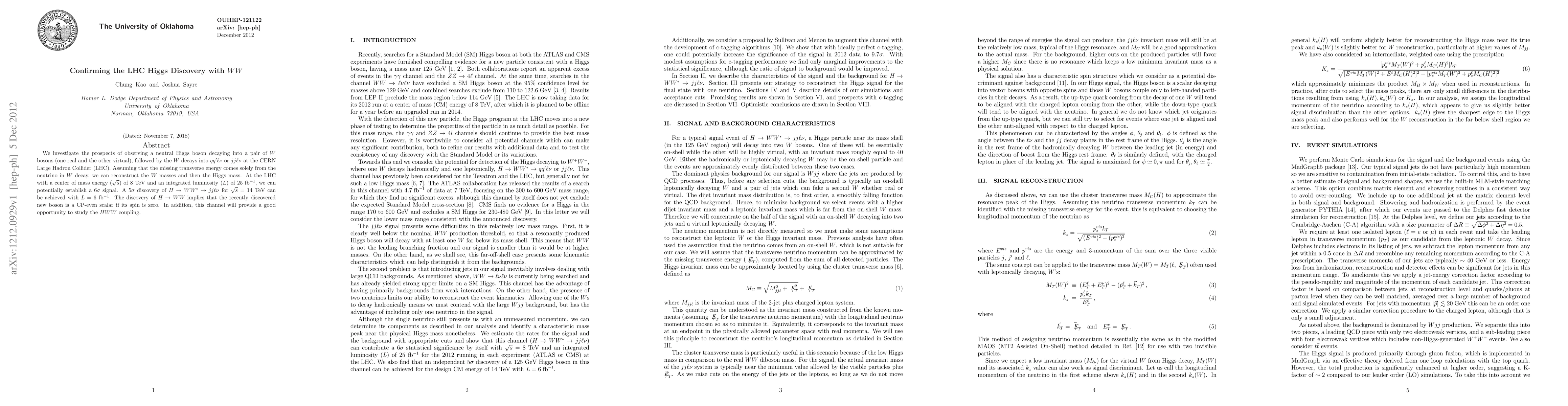 This paper explores the potential for confirming the discovery of the Higgs boson at the LHC through its decay into a pair of W bosons, with one W being real and the other virtual. At 8 TeV and 25 fb$^{-1}$, a 6σ signal can be established, while 14 TeV and 6 fb$^{-1}$ allow for a 5σ discovery, confirming the Higgs boson as a CP-even scalar and offering insights into the HWW coupling.