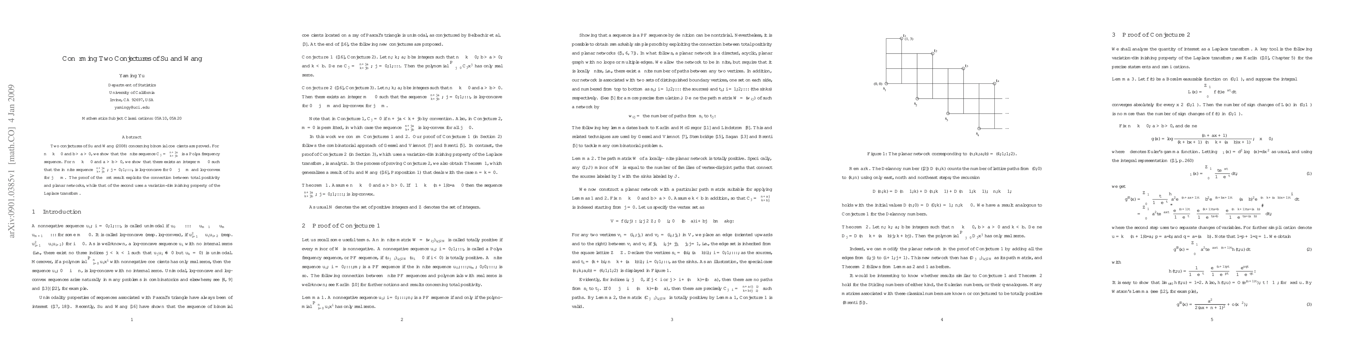 Two conjectures of Su and Wang (2008) concerning binomial coefficients are proved. For $n\geq k\geq 0$ and $b>a>0$, we show that the finite sequence $C_j=\binom{n+ja}{k+jb}$ is a P\'{o}lya frequency sequence. For $n\geq k\geq 0$ and $a>b>0$, we show that there exists an integer $m\geq 0$ such that the infinite sequence $\binom{n+ja}{k+jb}, j=0, 1,...$, is log-concave for $0\leq j\leq m$ and log-convex for $j\geq m$. The proof of the first result exploits the connection between total positivity and planar networks, while that of the second uses a variation-diminishing property of the Laplace transform.
