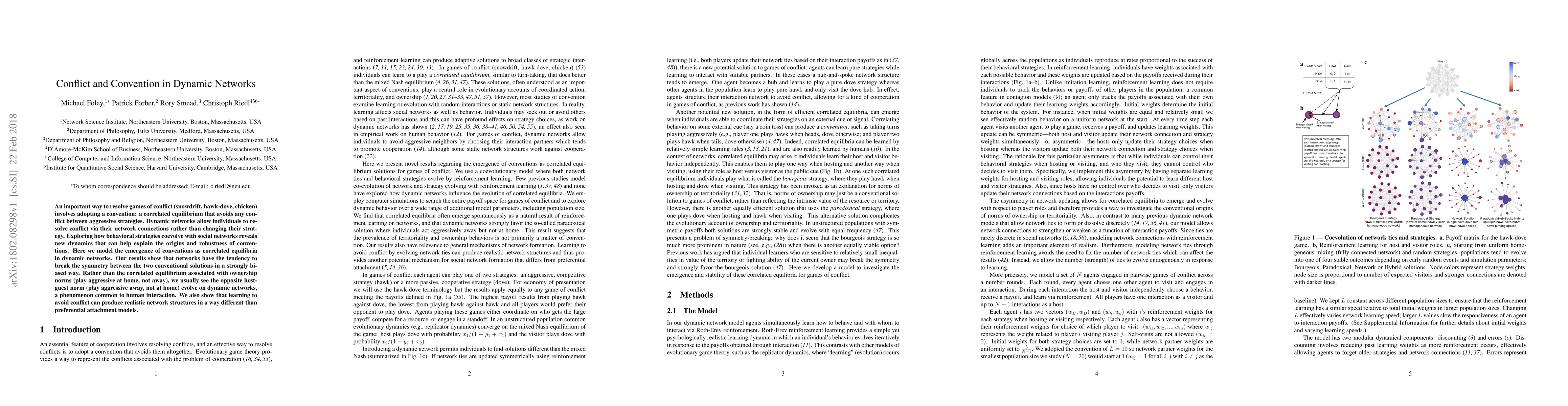This paper models the emergence of conventions in dynamic networks to resolve conflict games, finding that networks tend to favor the "host-guest norm" over the "ownership norm," mirroring human social behavior. It also demonstrates that learning to avoid conflict can generate realistic network structures distinct from traditional models.