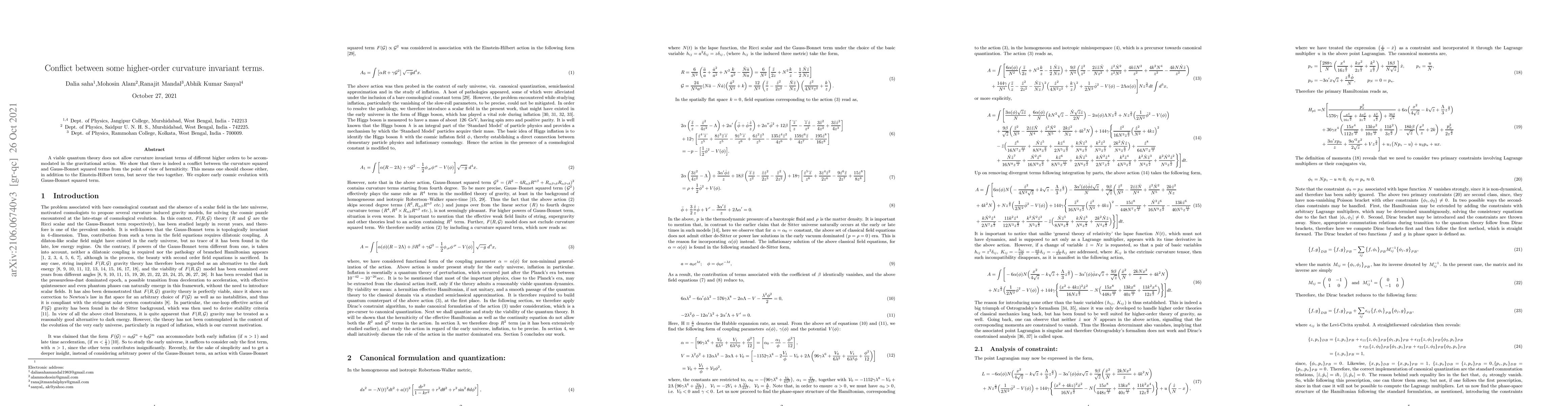 A viable quantum theory does not allow curvature invariant terms of different higher orders to be accommodated in the gravitational action. We show that there is indeed a conflict between the curvature squared and Gauss-Bonnet squared terms from the point of view of hermiticity. This means one should choose either, in addition to the Einstein-Hilbert term, but never the two together. We explore early cosmic evolution with Gauss-Bonnet squared term.