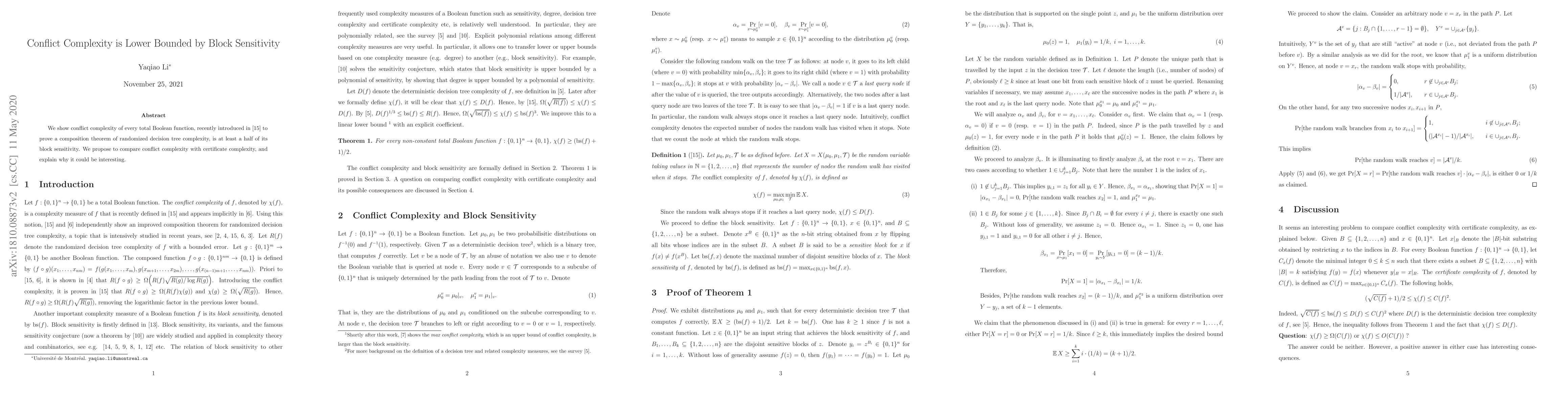 We show conflict complexity of every total Boolean function, recently introduced in [Swagato Sanyal. A composition theorem via conict complexity. arXiv preprint arXiv:1801.03285, 2018.] to prove a composition theorem of randomized decision tree complexity, is at least a half of its block sensitivity. We propose to compare conflict complexity with certificate complexity, and explain why it could be interesting.