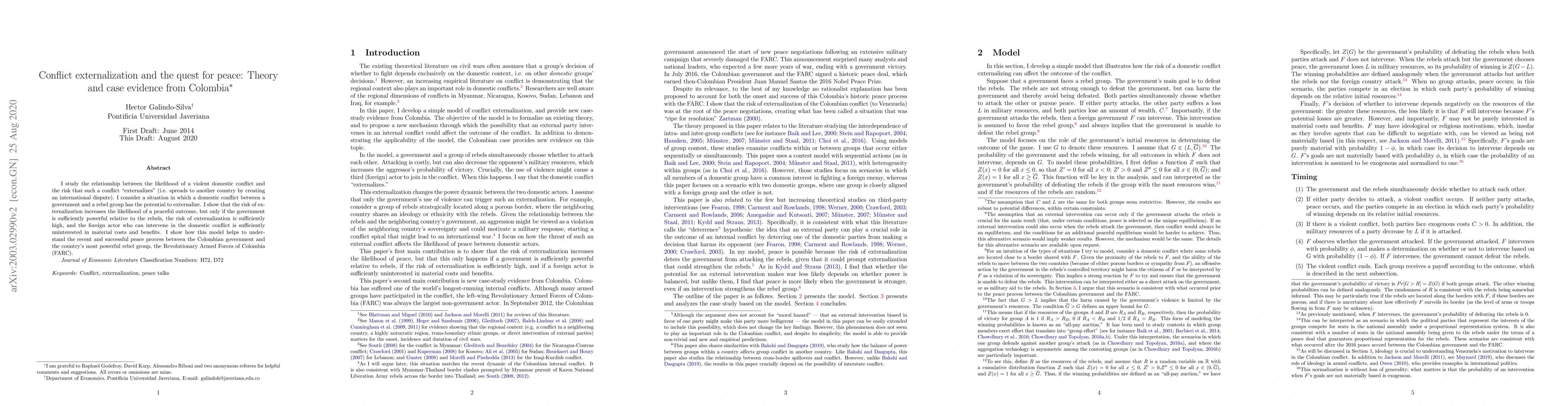 This paper explores how the risk of a domestic conflict externalizing into an international dispute can enhance the likelihood of peace, particularly in Colombia. It finds that when the government is strong, the externalization risk is high, and foreign actors are indifferent to material gains, the chances for a peaceful resolution increase, as evidenced by the peace process with FARC.