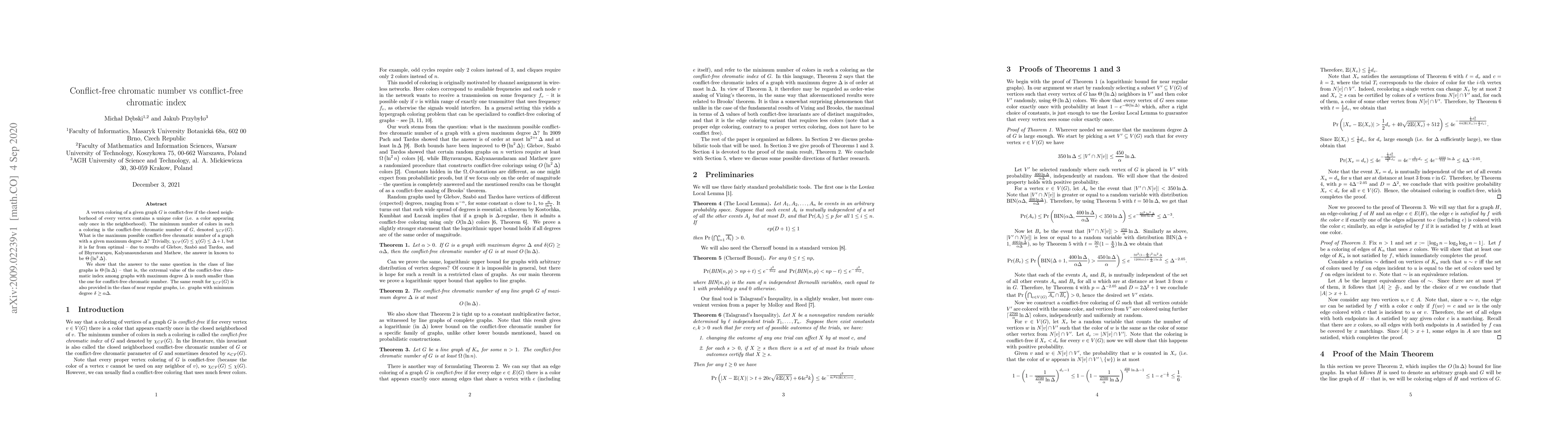 This paper investigates the conflict-free chromatic number ($\chi_{CF}(G)$) and conflict-free chromatic index in graphs, showing that for line graphs and near regular graphs, the conflict-free chromatic index is $\Theta(\ln\Delta)$, significantly lower than the previously known $\Theta(\ln^2\Delta)$ for $\chi_{CF}(G)$.