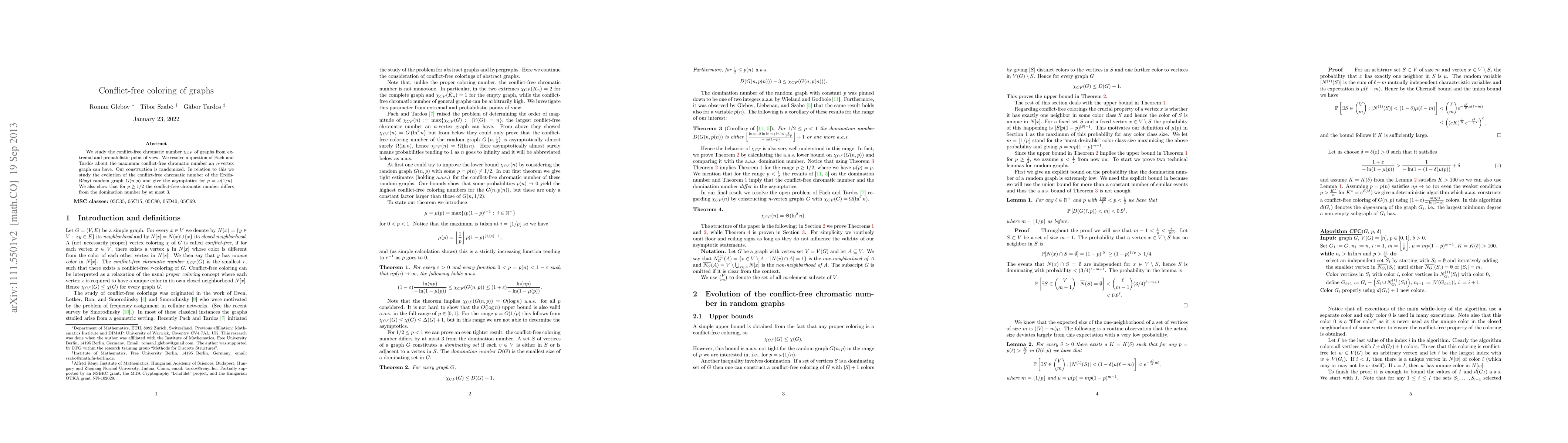 This paper studies conflict-free coloring of graphs, resolving a question about maximum conflict-free chromatic number for n-vertex graphs. It also explores the evolution of conflict-free chromatic number in random graphs and its relation to domination numbers.