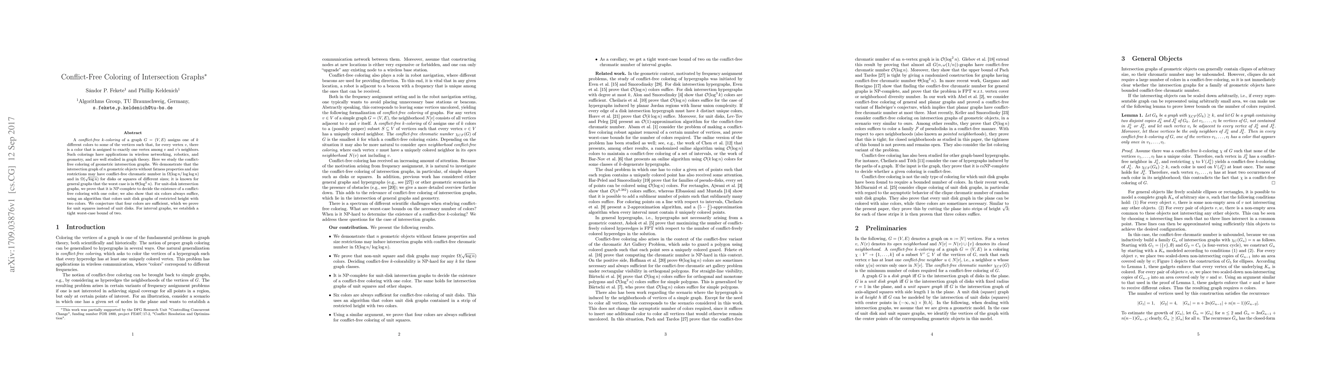 The paper studies conflict-free coloring of intersection graphs of geometric objects, focusing on unit-disk and square intersection graphs, and proving complexity results and upper bounds for color requirements.