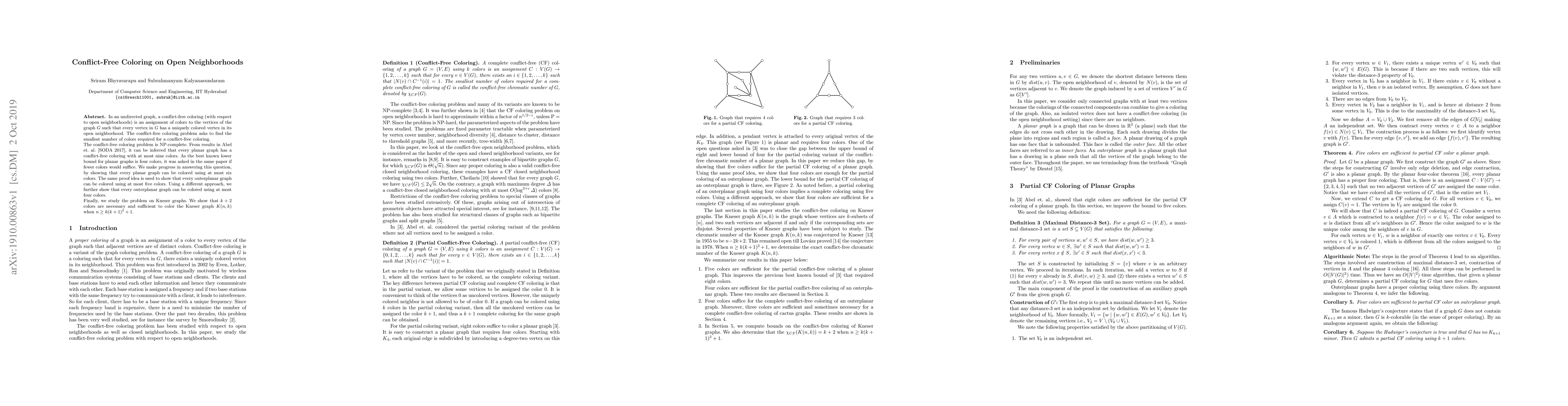 In an undirected graph, a conflict-free coloring (with respect to open neighborhoods) is an assignment of colors to the vertices of the graph $G$ such that every vertex in $G$ has a uniquely colored vertex in its open neighborhood. The conflict-free coloring problem asks to find the smallest number of colors required for a conflict-free coloring. The conflict-free coloring problem is NP-complete. From results in Abel et. al. [SODA 2017], it can be inferred that every planar graph has a conflict-free coloring with at most nine colors. As the best known lower bound for planar graphs is four colors, it was asked in the same paper if fewer colors would suffice. We make progress in answering this question, by showing that every planar graph can be colored using at most six colors. The same proof idea is used to show that every outerplanar graph can be colored using at most five colors. Using a different approach, we further show that every outerplanar graph can be colored using at most four colors. Finally, we study the problem on Kneser graphs. We show that $k+2$ colors are necessary and sufficient to color the Kneser graph $K(n,k)$ when $n\geq k(k+1)^2 + 1$.