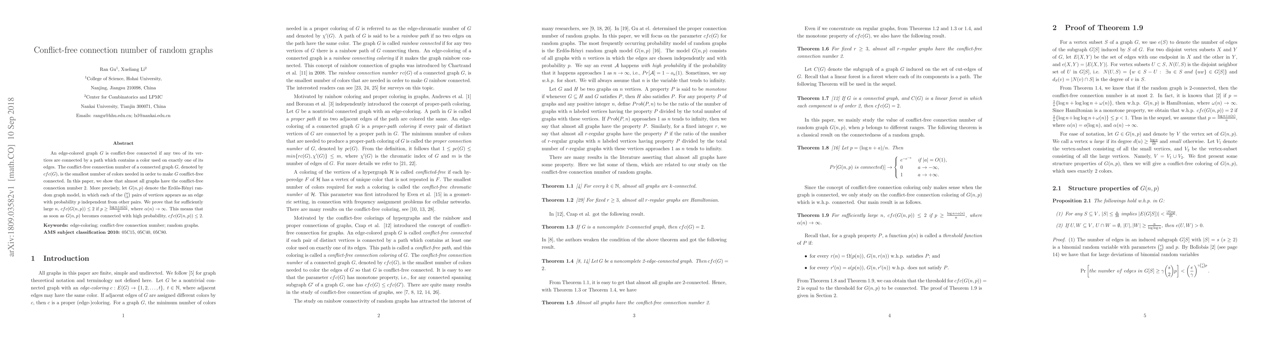 This paper investigates the conflict-free connection number of random graphs, proving that almost all graphs require at most 2 colors for conflict-free connectivity. Specifically, for large $n$, if $p \ge \frac{\log n + \alpha(n)}{n}$ with $\alpha(n) \rightarrow \infty$, then $G(n,p)$ is conflict-free connected with high probability using only 2 colors.