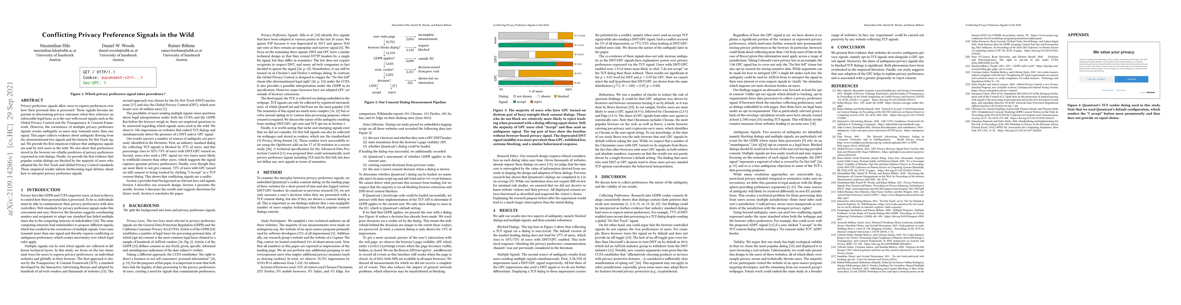A study found that ambiguous privacy preference signals occur when users transmit multiple privacy signals, highlighting a need for clearer guidelines in interpreting these signals. It also shows that many users block cookie dialogs due to adopted standards like Do Not Track and Global Privacy Control.